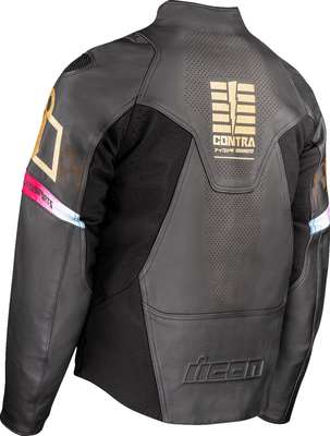 Contra3™ Rizz Rizz JacketPre-curved arms are designed for an aggressive riding stance 1.2 mm - 1.4 mm Brazillian cowhide chassis D3O® level 1 impact protectors in the shoulders, elbow and back Strategic laser cut perforations allow adequate airflow in warmer riding conditions Removable full-length insulated liner Custom Icon graphics Reflective accents Premium YKK® zippers, zippered cuff closure EN 17092-4:2020