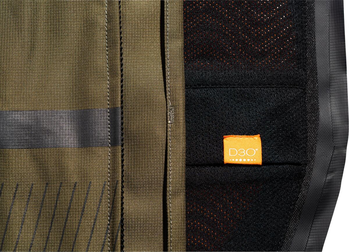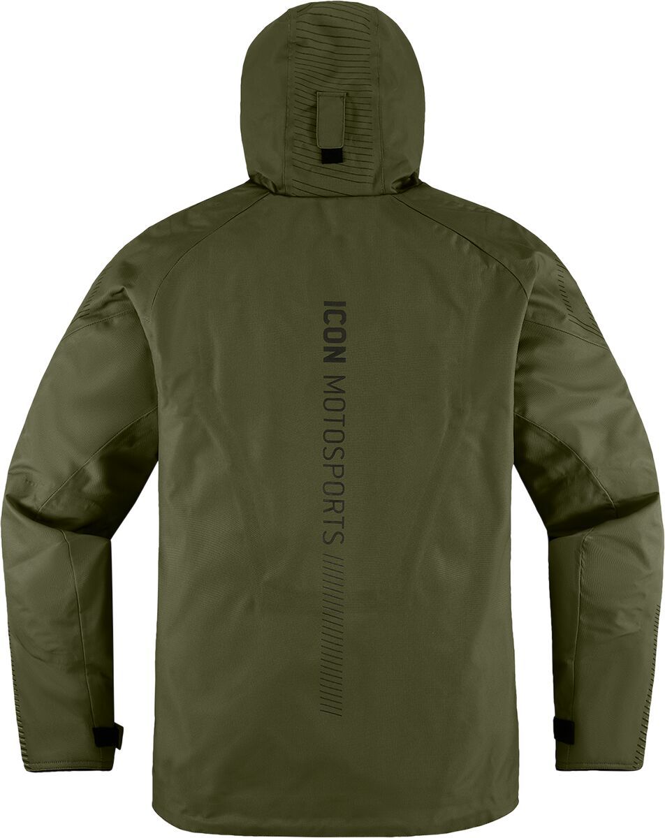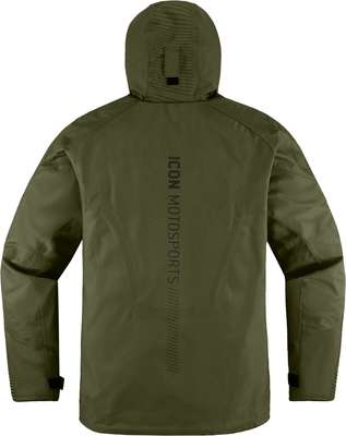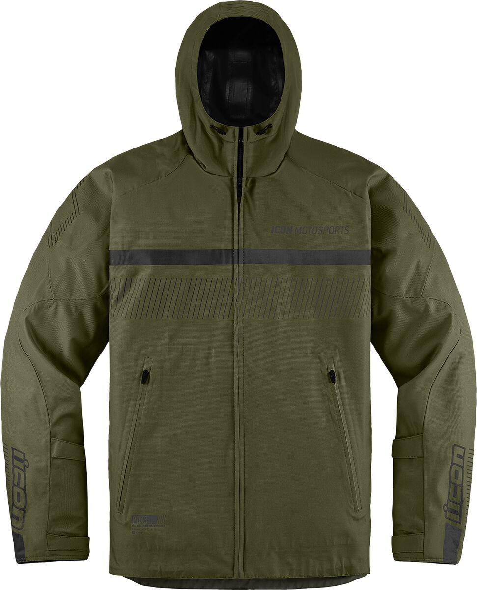 PDX3™ JacketRemovable insulated vest liner Internal 300D polyester reinforcements Hycor™ waterproof/breathable chassis Oversized pit vents ICON® relaxed fit Roll and stow hood Back protector EN 1621-2 Level 1 Premium D3O® impact protectors in the elbows, shoulders, and back Reflective graphics