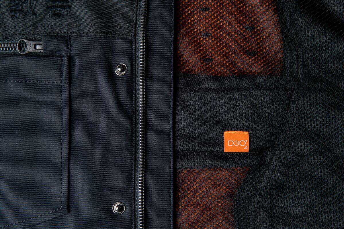 Upstate Canvas National™ JacketDurable 400D polyester and cotton stretch canvas mesh chassis with internal 300D polyester reinforcements in elbows and shoulders D3O® LP1 elbow and shoulder impact protectors Removable D3O® Viper back protector Zipper vents at cuff and chest YKK® zippers ICON® relaxed fit Back protector EN 1621-2 Level 1