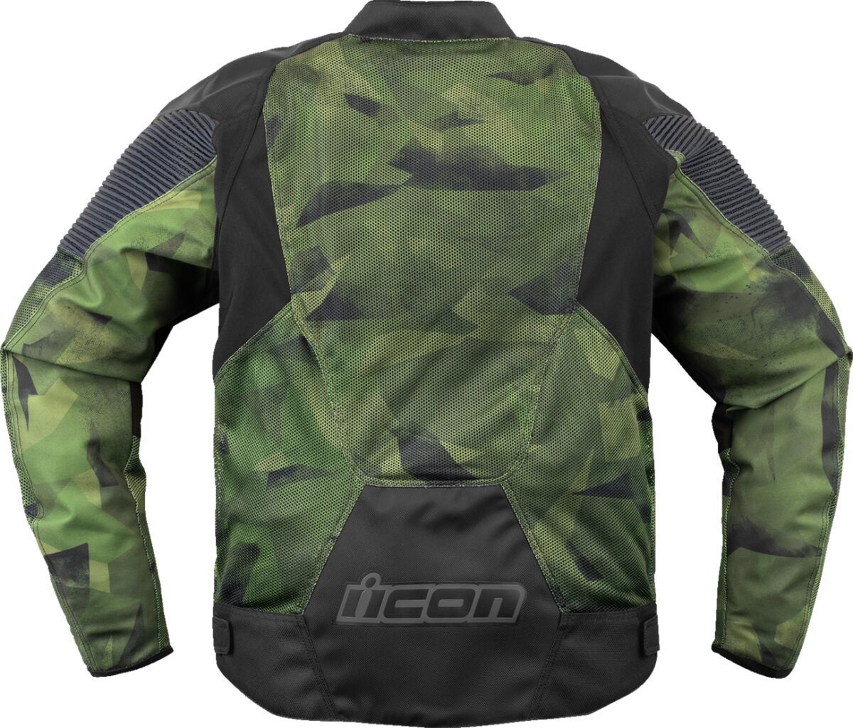 Overlord3 Mesh™ Camo JacketOverlord3 mesh™ camo jacket constructed of durable 300D polyester and Iron Weave™ mesh chassis and sleeves Internal 300D polyester panels for reinforcement plus D30® impact protectors in the back, elbows, and shoulders Optimum airflow for hot weather riding Icon® Sport Fit has pre-curved arms and waist adjusters Removeable insulated vest liner Back protector EN 1621-2 Level 1 Jacket Shell: 98% Polyester & 2% Polyurethane. Inner/lining: 100% Polyester. Liner Body: 100% Polyester. Fill: 100% Polyethylene Fiber
