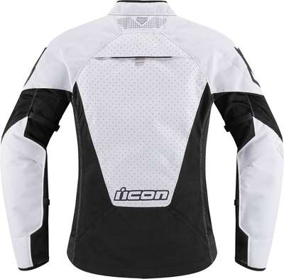 Women's Mesh™ AF JacketICON® Women’s sport fit Durable 300D polyester and Iron Weave™ Mesh chassis YKK® zippers Adjustable waist and arm straps Back protector EN 1621-2 Level 1 D3O® Viper back impact protector; D3O® T5 EVO shoulder and elbow protectors EN 17092-4:2020 – A Class