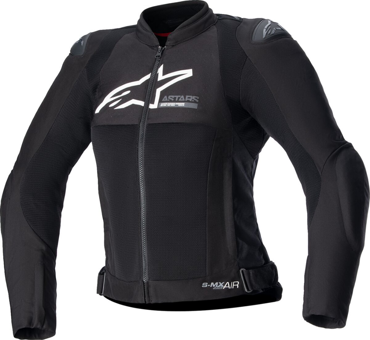 Stella SMX Air JacketTech-Air® Ready Dedicated female fit Ergonomic design for optimal sport movement and flexibility Strategic stretch inserts on side torso and upper back panel Waist adjusters Detachable windproof liner Mesh chassis with mechanical stretch combined with polyfabric 450D perforated in key areas including the chest panel Waterproof compartment New inner construction for Nucleon protection insert upgrades, ready to accommodate the new Alpinestars’ long back protector insert Nucleon Flex Plus armor DFS lite shoulder external protectors EN 17092-4:2020 – A Class Elbow & shoulder protection EN 1621-1:2012 Level 1 87% Polyester & 13% Polyamide. Inner/lining: 100% Polyester