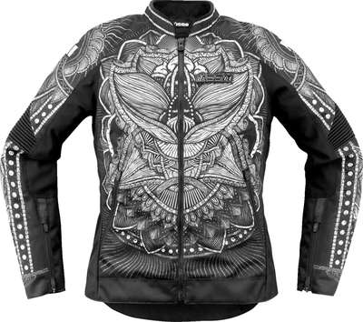 Women's Overlord3 Noble™ JacketThe allover graphics are printed on a 1680D and 300D polyester chassis with internal 300D polyester reinforcements ICON® Women's Sport Fit with pre-curved arms and shaped body AirFly™ center front mesh panel with integrated lower back exhaust vent, and cuff vents Removable D3O® Viper back protector; D3O® LP1C elbow and shoulder impact protectors Removeable insulated vest liner Back protector EN 1621-2 Level 1