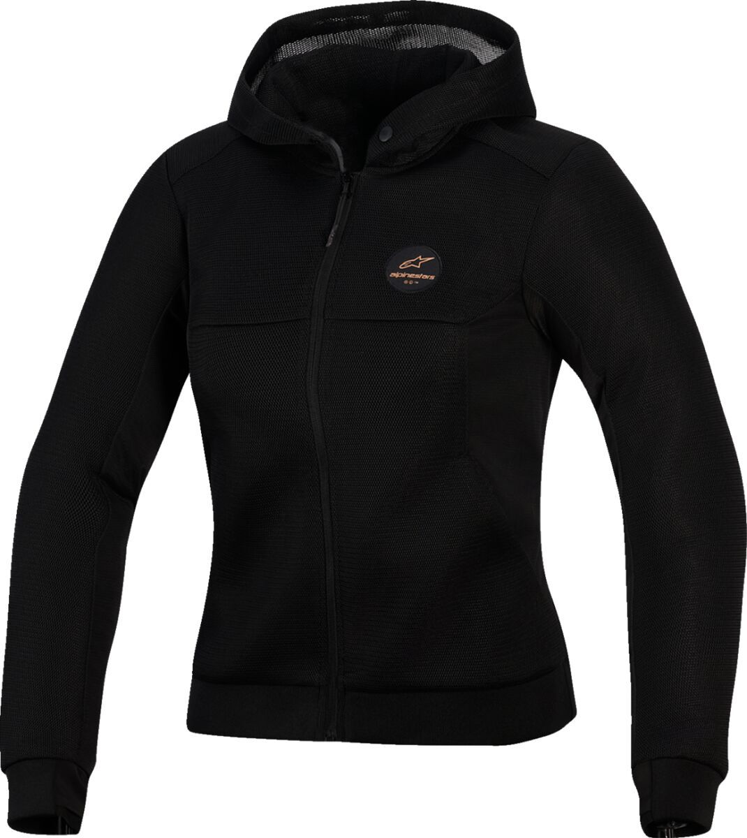 Stella Chrome Super Airflow HoodieAnatomically engineered for an optimized women’s specific fit Full airflow, highly-resistant 3D mesh construction for superior ventilation and breathability Athletic cut for an adaptive performance fit suitable for several types of riding, while still promoting mobility and exceptional freedom of movement Dedicated reinforcements at the shoulders and elbows for exceptional abrasion resistance Equipped with functional features including a quick adjust hood with a snap collar button to tighten the hood securely around the neck while riding, providing added protection from the elements The back snap hood connection keeps the hood stable when not in use, preventing it from flapping in the wind when riding High performance 3D and 2D main construction for the optimum blend of durability, comfort, light weight, breathability and ventilation Ribbed stretch cuffs or optimized comfort and a precise fit Reinforcement panels at the elbows and shoulders for effective protection against abrasion and impacts Dual hand pockets with zippered compartments for safe and secure storage of essentials One waterproof pocket for added protection against moisture and rain Elastic loop sleeve holder to retain the sleeve in position, preventing it from riding up while riding Tech-Air® 7x, Tech-Air® 5 PLASMA and Tech-Air® 3 ready 100% Polyester Inner/Lining: 100% Polyester
