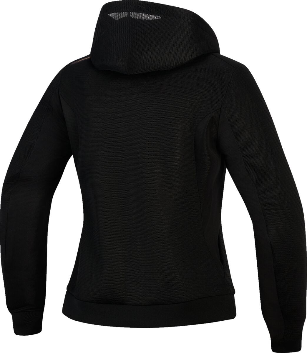 Stella Chrome Super Airflow HoodieAnatomically engineered for an optimized women’s specific fit Full airflow, highly-resistant 3D mesh construction for superior ventilation and breathability Athletic cut for an adaptive performance fit suitable for several types of riding, while still promoting mobility and exceptional freedom of movement Dedicated reinforcements at the shoulders and elbows for exceptional abrasion resistance Equipped with functional features including a quick adjust hood with a snap collar button to tighten the hood securely around the neck while riding, providing added protection from the elements The back snap hood connection keeps the hood stable when not in use, preventing it from flapping in the wind when riding High performance 3D and 2D main construction for the optimum blend of durability, comfort, light weight, breathability and ventilation Ribbed stretch cuffs or optimized comfort and a precise fit Reinforcement panels at the elbows and shoulders for effective protection against abrasion and impacts Dual hand pockets with zippered compartments for safe and secure storage of essentials One waterproof pocket for added protection against moisture and rain Elastic loop sleeve holder to retain the sleeve in position, preventing it from riding up while riding Tech-Air® 7x, Tech-Air® 5 PLASMA and Tech-Air® 3 ready 100% Polyester Inner/Lining: 100% Polyester
