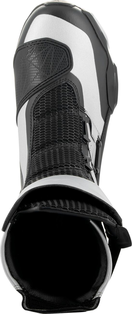 SP-X BOA BootsSP-X boots are a sleek sport boot designed to fit under tech riding pants and provide superior walking capability Optimized for the sport and sport touring rider, the SP-X are compact, mid-height boots with premium levels of protection and comfort on and off the bike The upper is constructed from a combination of Rideknit® material and knitted mesh, plus seamless thermo-welded parts The lower features a TPU heel counter, toe slider, and the Alpinestars Transversal Protection Frame (TPF) on the sole, allowing for high levels of protection against impacts and any bending or twisting Additionally, the sole also features an all-new design with an asymmetric back heel to facilitate the rider's natural stride and promote off-bike stability For protection, the SP-X has an integrated shin impact protector, dual-density ankle discs, plus TPU shift pad and toe slider reinforcement For comfort, the knitted areas on the front and back flex points offer great freedom of movement, while the PU midsole with integrated double cushioned heel compound and removable OrthoLite® insock, provide great walking comfort In and out is facilitated by a medial zip combined with the BOA speed lace system for compact and precise closure SP-X boots are perfect for those sport riders looking for coverage and protection but without the full race boot, over the pant look 36% Microfiber, 24% Polyurethane, 21% Polyester & 19% TPU. Inner/lining: 61% Polyester, 28% Synthetic & 11% Microfiber