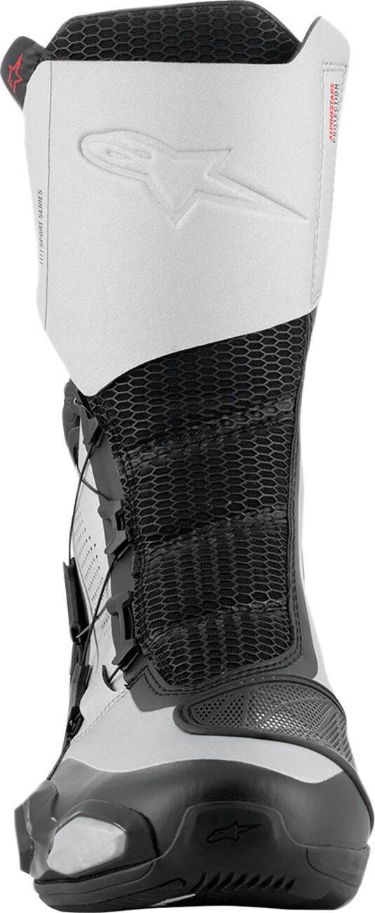 SP-X BOA BootsSP-X boots are a sleek sport boot designed to fit under tech riding pants and provide superior walking capability Optimized for the sport and sport touring rider, the SP-X are compact, mid-height boots with premium levels of protection and comfort on and off the bike The upper is constructed from a combination of Rideknit® material and knitted mesh, plus seamless thermo-welded parts The lower features a TPU heel counter, toe slider, and the Alpinestars Transversal Protection Frame (TPF) on the sole, allowing for high levels of protection against impacts and any bending or twisting Additionally, the sole also features an all-new design with an asymmetric back heel to facilitate the rider's natural stride and promote off-bike stability For protection, the SP-X has an integrated shin impact protector, dual-density ankle discs, plus TPU shift pad and toe slider reinforcement For comfort, the knitted areas on the front and back flex points offer great freedom of movement, while the PU midsole with integrated double cushioned heel compound and removable OrthoLite® insock, provide great walking comfort In and out is facilitated by a medial zip combined with the BOA speed lace system for compact and precise closure SP-X boots are perfect for those sport riders looking for coverage and protection but without the full race boot, over the pant look 36% Microfiber, 24% Polyurethane, 21% Polyester & 19% TPU. Inner/lining: 61% Polyester, 28% Synthetic & 11% Microfiber