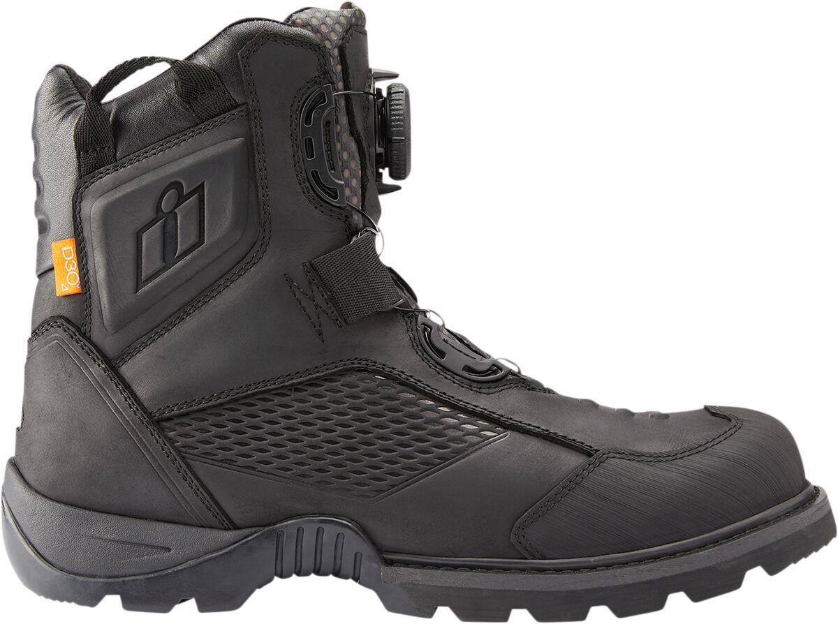 Stormhawk BootsPremium leather uppers feature a water-resistant finish Breathable eVent waterproof liners help keep feet dry Highly lugged oil/ slip-resistant rubber outsoles provide peak motorcycle performance Open-cell polyurethane insoles cushion feet BOA® Fit System for easy on/ off and a comfortable fit Dual D3O® inserts provide ankle coverage Reinforced rubber toe-caps, reflective heel accents and shifter interface nubs