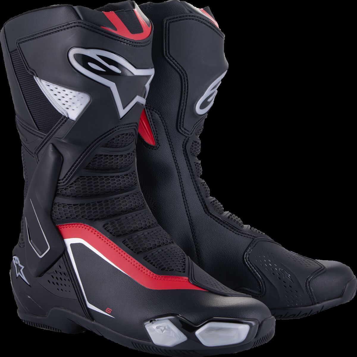 SMX-6 V3 BootsPacked with a host of innovative safety and protective features, SMX-6 V3 is the ultimate track and performance riding all-rounder, and incorporates race-derived technology and materials to give riders a crucial performance edge on the track, and the street Advanced microfiber upper construction for lightweight high performance protection against abrasion and superb levels of flexibility Front flex and back flexion zones are constructed with textile over-injected with a soft Thermoplastic Polyurethane (TPU) for enhanced impact abrasion while also promoting a natural forwards and backwards movement Alpinestars unique ankle brace protection system provides a bio-mechanical support and protection between the lateral top calf, the shin and ankle, for superior ankle articulation, while also limiting hyper-torsion, hyper-extension and hyper-flexion, as well as providing Achilles and ankle impact protection Alpinestars Lace-Lock System is constructed from an advanced polymer resin for a guaranteed quick, precise and secure closure Equipped with a TPU shifter zone for superior protection on the lower medial side Strategically positioned, race-derived TPU shin plate protector delivers superior impact and abrasion resistance Dual density TPU ankle protectors are strategically positioned between the upper and padded lining to provide the strategic protection in key areas Replaceable, dual density TPU toe slider with screw-in assembly provides comprehensive protective coverage around the outer toe area while still being supremely flexible for walking comfort Replaceable heel slider and external side heel slider are strategically positioned for optimum shock dissipation and absorption, while promoting sliding in the event of an accident 37% TPU, 35% Microfiber, 11% Polyester, 8% Polyurethane, 8% TPR & 1% Elastic. Inner/lining: 82% Polyester & 18% Synthetic