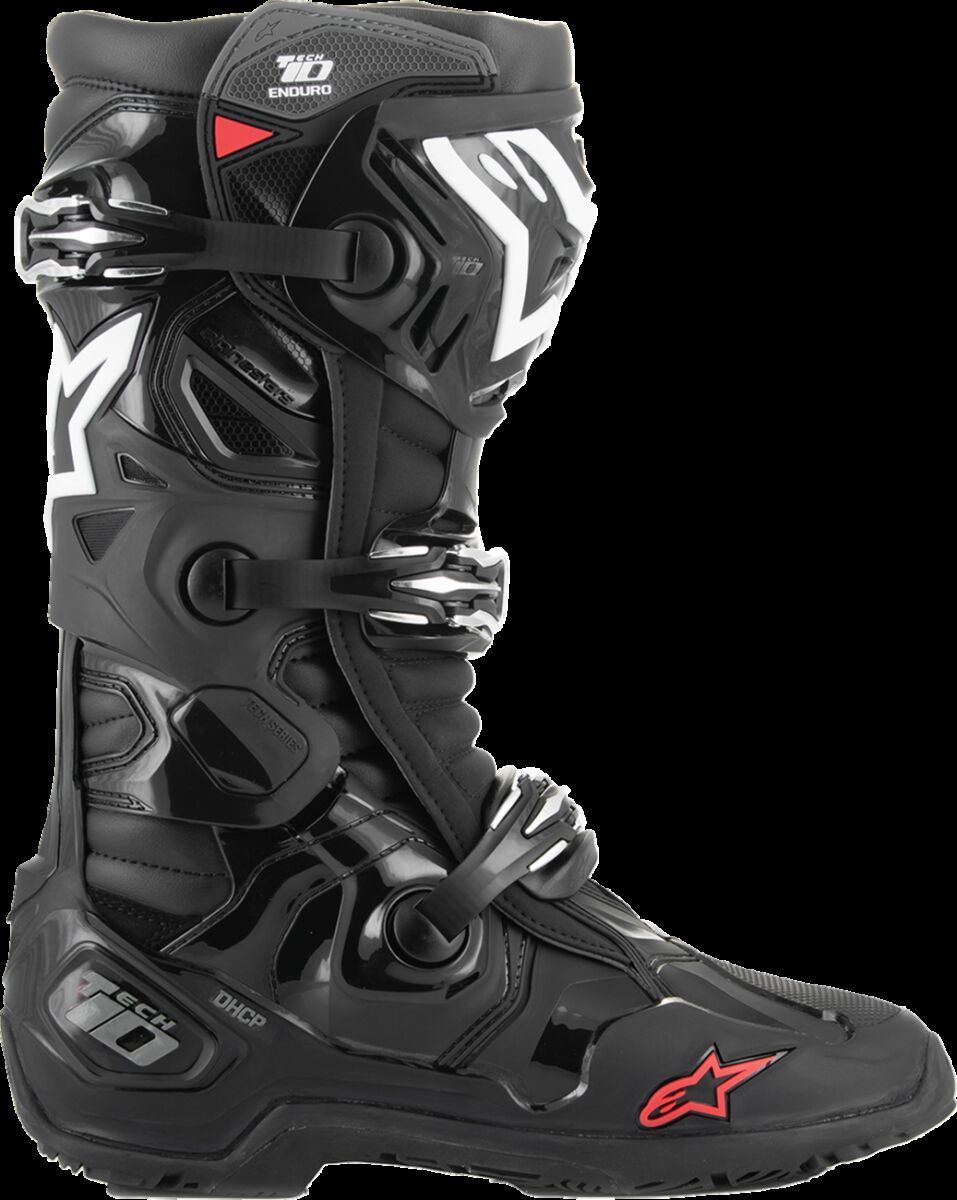Tech 10 Enduro BootsFeatures its own dedicated 'Enduro' spec dual compound sole that is seamlessly integrated to the multi-density foot base structure with built-in support to offer superior durability, grip and feel while riding, and enhanced performance on the shifter Design improves overall functionality; performance and safety, while decreasing weight and reducing material volume Features patented Frontal Flexion Control Frame Combining dual front and the rear blade connectors, the frame acts as a shock absorber by distributing energy across boot frame while controlling forward and rearward flex, gives a complete and seamless flexion control system, from the footshell all the way up to the shin plate, offering high performance double motion control, preventing over-compression and hyper-extension Equipped with Alpinestars ankle control system, which is integrated in the outer shell to allow natural ankle movement, vertical compression control and improved flex control and impact resistance Inner ankle brace and the unique heel protection innovation, patented Dynamic Heel Compression Protector (DCHP), significantly reduces the effect of excessive, potentially injury-causing, energy being transferred to the ankle and lower leg Frontal Flex Frame, a complete and seamless flexion control system, from foot shell all the way up to the shin plate, offering high-performance double motion control to prevent over-compression and hyper-extension Dual compound removable anatomic footbed Easier to operate, more secure mechanism on the triple buckle closure system Thermoplastic Polyurethane (TPU) lower shell features an innovative design on the shifter area, with a dedicated design for the left and right foot Lightweight microfiber upper features extensive TPU protection on the toes, foot, heel, ankle, calf, and shin with extra hard compounds on the toe-box, heel for additional impact and abrasion resistance Equipped with a poly-fabric lining with 3D open cell foam and anti-sliding suede reinforcement on the heel area for enhanced abrasion resistance Co-injected for strength and to maintain the boot's structure, exclusive TPU and rubber compound panels provide superb levels of grip contact, durability, and heat resistance Shin plate area is equipped with strategically positioned ventilation windows for superior airflow and ventilation without compromising impact protection Soft microfiber gaiter features a dedicated design especially for the back of the boots that effectively seals out excessive water and dirt entry Dual closure system with an internal microfiber flap, plus hook and loop fasteners, for a precise fit closure Closure system includes lightweight polymer buckles plus an aluminum frame with self-aligning, quick release closures for a customized secure fitment Pull flap is engineered to offer increased prehensility 61% TPU, 26% Microfiber, 4% Microfiber Suede, 4% Rubber, 3% TPR & 2% Other. Inner/lining: 71% Polyester, 21% Microfiber & 8% Microfiber Suede