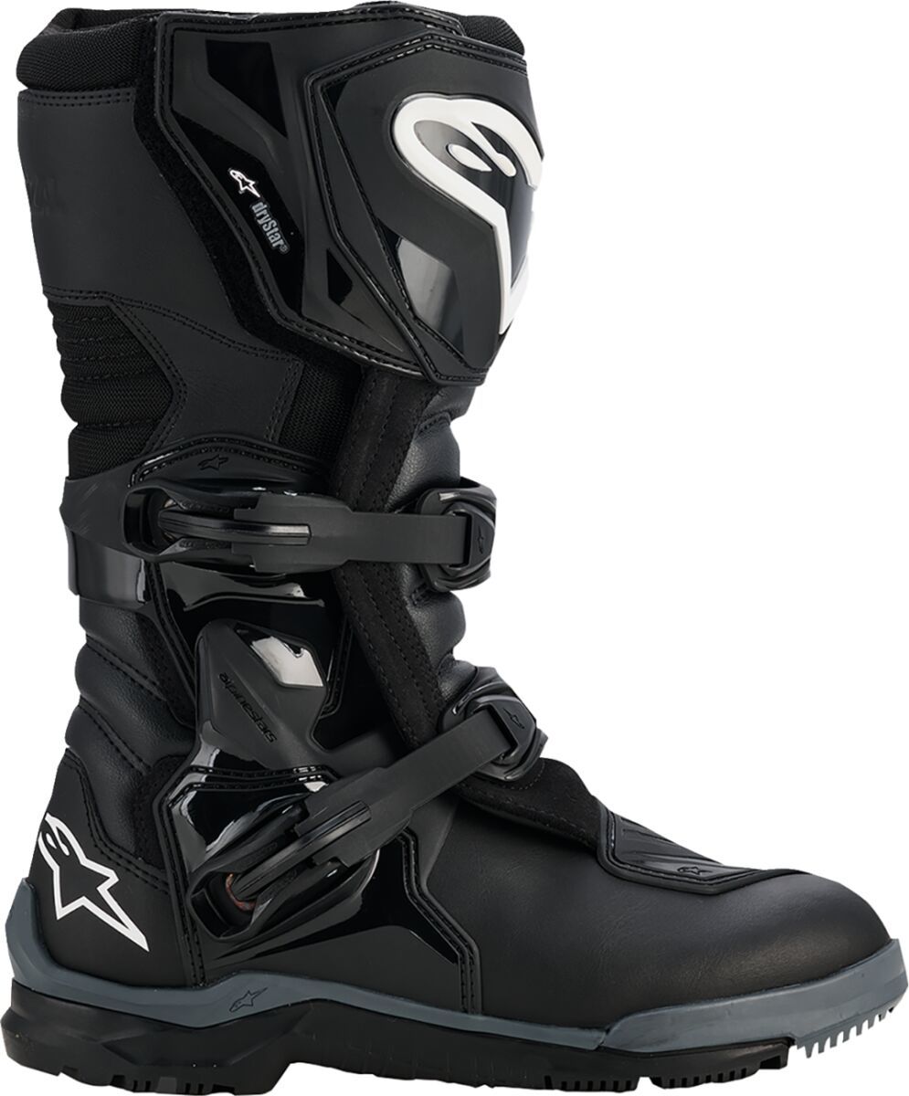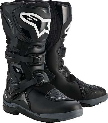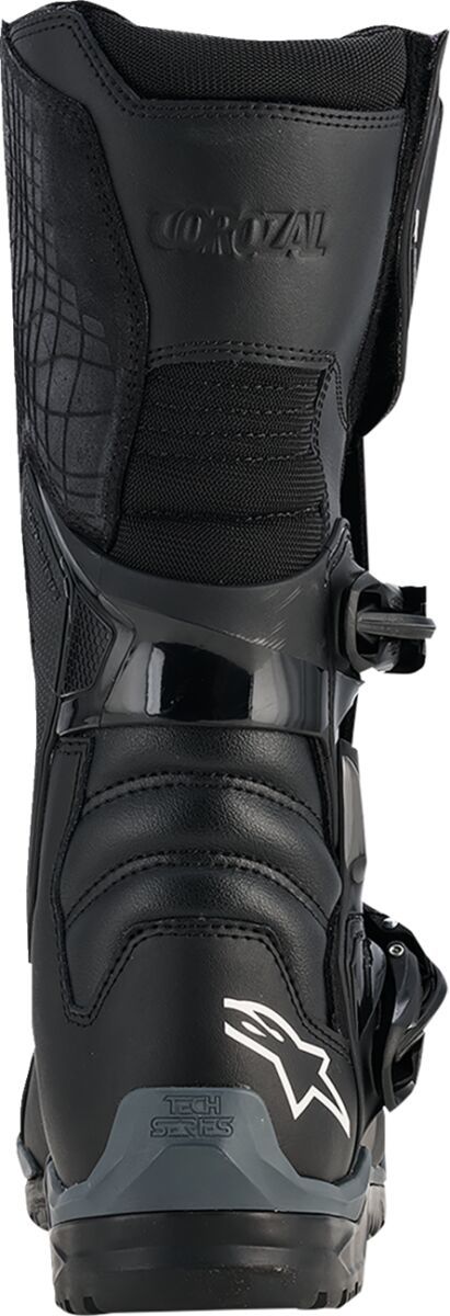 Corozal Adventure Drystar® BootsBlack boot upper is made from Polyurethane (PU)-coated leather with a high suede leather medial panel for superior grip Front and rear boot bellows make with lightweight microfiber for increased durability and abrasion resistance Rear reflective insert for improved visibility Extended PU-coated front leather gaiter helps keep out water and dirt Rear gaiter has rubber insert for flexibility and comfort Thermoplastic Polyurethane (TPU) shin and calf plate offer support and resistance to impacts Bio-mechanical lateral flexi-blade boot system provides excellent front and rear movement while offering support and protection to the ankle TPU shift pad is made with a technical texture for added grip; foam padding on bottom of the shift pad provides better comfort Wide entry aperture for convenience with hook-and-loop upper closure flap that allows a wide range of adjustment for an excellent fit TPU double-density ankle protector on medial side for protection Boot closure system includes two polymer ratchet buckles with memory feature and quick-release locking system that is self-aligning for easy, precise closure All boot buckles are replaceable Soft foam surrounds the ankles and collar for comfort and shock-absorbing performance Drystar® membrane layer between boot upper lining Toe box and heel counter reinforcements layered under the boot upper Replaceable anatomical Ethylene-Vinyl Acetate (EVA) footbed with Lycra® lining on top Polypropylene (PP) insole with steel shank is co-injected for excellent feel and safety Vulcanized rubber compound for optimal comfort and grip 56% Cow Leather, 24% TPU, 13% Microfiber & 7% TPR. Inner/linning: 100% Polyester