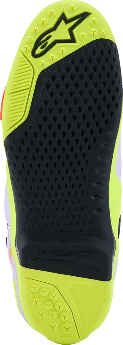 Tech 10 Supervented BootsConstruction uses a highly breathable, perforated microfiber with internal perforated padding Highly ventilated perforated padding for optimized ventilation and airflow Thermoplastic Polyurethane (TPU) features is combined with ventilation zones and a new air flow system sole for breathability and superior ventilation Two large inlet ports on front of boot with exhausts at back for optimized levels of airflow and heat exchange 3D Higher Spring insole creates an effective cooling system using air channels within the sole for optimal levels of ventilation, while also creating a cushioning effect for enhanced levels of comfort Evolutionary new shin plate design with ventilation windows strategically positioned to allow more ventilation and a light weight without compromising the impact protection Air vents on the Polyurethane (PU) lateral calf plus breathable mesh insert improve comfort and reduce fatigue on short and long rides New performance double pivot motion control system features: a medial and lateral double pivot system for improved levels of flexibility and precision control, engineered bi-density front flexion control is strategically positioned over the mesh area, combined with a dual front blade system and shock absorber insert to offer mechanical progressive force release to dampen and absorb impact energies and a re-designed dual density TPU rear blade system is engineered to prevent hyper-extension while offering improved flex control and impact resistance Co-injected for strength and structure, the exclusive TPU compound panels provide superb levels of grip contact and durability Completely re-designed sole with proprietary grip sculpturing to improve foot-peg performance, grip and mud and water run-off. Exclusive dual compound sole is seamlessly integrated to the multi-density foot base structure with built-in support. The sole offers superior durability, grip and feel while riding, and improved performance on the shifter Central sole insert features a micro grip and side hooking grip design. It is easily replaceable and Alpinestars offers a full sole replacement and boot repair service Perforated footbed for additional cooling Inner boot has a mesh construction for optimal levels of airflow and light weight, with a technical perforated bottom for additional cooling Anatomically optimized for weight-saving and ergonomics, the new mechanical buckle closure system features a nylon and fiberglass compound for improved durability and strength. The new slim-line buckle closure system includes high-impact bridge closures which are cold forged for precision and strength. The buckle closure system features a memory and a quick release/locking system with self-aligning design for easy, precise closure and improved riding performance and security. All buckles are easily replaceable Innovative, lightweight upper combines advanced lightweight microfiber with an impact and abrasion resistant TPU shell The shin incorporates a unique TPU blade system engineered to prevent frontal hyper-extension and offer greater flex control Soft microfiber gaiter helps seal out excessive water and dirt entry, while the 3D mesh lining ensures improved air circulation and comfort 3D mesh lining incorporates anti-sliding suede on heel area to keep the foot located inside the boot Frontal protection features a dual closure system with an internal microfiber flap, plus hook and loop fasteners for a precise fit closure attached securely with a micro-adjustable, easy to operate, lightweight buckle Foot shell features five different compounds in a single lightweight piece to offer strength while maintaining flexibility and structural integrity. The foot shell incorporates heel and toe protection and is highly resistant against abrasion and impact while adding to the boot’s overall durability. The foot shell also includes an integrated shank for support and structural integrity Built into the Tech 10’s unique and lightweight single-piece co-injected foot chassis is the patented Dynamic Heel Compression Protector (DHCP), an innovative safety feature which includes a fully integrated collapsible heel area with expanded polyfoam to absorb high impact energies during a crash. DCHP features a directional impact protection system which significantly reduces the effect of excessive, potentially injury-causing energy being transferred to the ankle and lower leg. DHCP has been developed and tested in the demanding circuits of professional Supercross and Motocross Contoured calf protector ergonomically wraps around the rear leg and is constructed from a dual density compound rear blade system to offer progressive dampening of excessive torsional forces 67% TPU, 12% Microfiber, 7% Polyester, 6% TPR, 4% Microfiber Suede & 4% Rubber. Inner/lining: 71% Polyester, 21% Microfiber & 8% Microfiber Suede