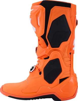 Tech 10 Supervented BootsConstruction uses a highly breathable, perforated microfiber with internal perforated padding Highly ventilated perforated padding for optimized ventilation and airflow Thermoplastic Polyurethane (TPU) features is combined with ventilation zones and a new air flow system sole for breathability and superior ventilation Two large inlet ports on front of boot with exhausts at back for optimized levels of airflow and heat exchange 3D Higher Spring insole creates an effective cooling system using air channels within the sole for optimal levels of ventilation, while also creating a cushioning effect for enhanced levels of comfort Evolutionary new shin plate design with ventilation windows strategically positioned to allow more ventilation and a light weight without compromising the impact protection Air vents on the Polyurethane (PU) lateral calf plus breathable mesh insert improve comfort and reduce fatigue on short and long rides New performance double pivot motion control system features: a medial and lateral double pivot system for improved levels of flexibility and precision control, engineered bi-density front flexion control is strategically positioned over the mesh area, combined with a dual front blade system and shock absorber insert to offer mechanical progressive force release to dampen and absorb impact energies and a re-designed dual density TPU rear blade system is engineered to prevent hyper-extension while offering improved flex control and impact resistance Co-injected for strength and structure, the exclusive TPU compound panels provide superb levels of grip contact and durability Completely re-designed sole with proprietary grip sculpturing to improve foot-peg performance, grip and mud and water run-off. Exclusive dual compound sole is seamlessly integrated to the multi-density foot base structure with built-in support. The sole offers superior durability, grip and feel while riding, and improved performance on the shifter Central sole insert features a micro grip and side hooking grip design. It is easily replaceable and Alpinestars offers a full sole replacement and boot repair service Perforated footbed for additional cooling Inner boot has a mesh construction for optimal levels of airflow and light weight, with a technical perforated bottom for additional cooling Anatomically optimized for weight-saving and ergonomics, the new mechanical buckle closure system features a nylon and fiberglass compound for improved durability and strength. The new slim-line buckle closure system includes high-impact bridge closures which are cold forged for precision and strength. The buckle closure system features a memory and a quick release/locking system with self-aligning design for easy, precise closure and improved riding performance and security. All buckles are easily replaceable Innovative, lightweight upper combines advanced lightweight microfiber with an impact and abrasion resistant TPU shell The shin incorporates a unique TPU blade system engineered to prevent frontal hyper-extension and offer greater flex control Soft microfiber gaiter helps seal out excessive water and dirt entry, while the 3D mesh lining ensures improved air circulation and comfort 3D mesh lining incorporates anti-sliding suede on heel area to keep the foot located inside the boot Frontal protection features a dual closure system with an internal microfiber flap, plus hook and loop fasteners for a precise fit closure attached securely with a micro-adjustable, easy to operate, lightweight buckle Foot shell features five different compounds in a single lightweight piece to offer strength while maintaining flexibility and structural integrity. The foot shell incorporates heel and toe protection and is highly resistant against abrasion and impact while adding to the boot’s overall durability. The foot shell also includes an integrated shank for support and structural integrity Built into the Tech 10’s unique and lightweight single-piece co-injected foot chassis is the patented Dynamic Heel Compression Protector (DHCP), an innovative safety feature which includes a fully integrated collapsible heel area with expanded polyfoam to absorb high impact energies during a crash. DCHP features a directional impact protection system which significantly reduces the effect of excessive, potentially injury-causing energy being transferred to the ankle and lower leg. DHCP has been developed and tested in the demanding circuits of professional Supercross and Motocross Contoured calf protector ergonomically wraps around the rear leg and is constructed from a dual density compound rear blade system to offer progressive dampening of excessive torsional forces 67% TPU, 12% Microfiber, 7% Polyester, 6% TPR, 4% Microfiber Suede & 4% Rubber. Inner/lining: 71% Polyester, 21% Microfiber & 8% Microfiber Suede