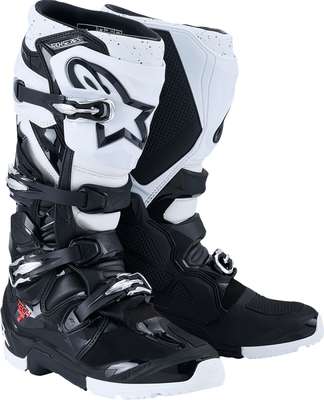 Tech 7 Enduro BootsUpper is constructed from light, innovative microfiber that is flexible and abrasion resistant Innovative, evolutionary Thermoplastic Polyurethane (TPU) shin plate construction for a greater range of fitment Shin plate features a reinforced hook-and-loop closure for a comfortable, customized fit Shin zone incorporates a TPU blade system engineered to prevent frontal hyper-extension and offer greater flex control Specially designed sole provides enduro riders with superior grip, durability, feel and a high level of structural rigidity Wide entry aperture for convenience with a hook-and-loop upper closure with TPU flap to allow a wide range of calf fitment adjustment and support Medial-facing area is constructed from one-piece TPU panel with a honeycomb structure for maximum grip contact with the bike and improved heat and abrasion resistance Top rear flexion of the boot is supported around the calf by an innovative TPU sliding blade system which dissipates the friction Ergonomic buckle system offers a secure and highly personalized fit Innovative TPU lateral ankle protection provides a bio-mechanical link between the middle lateral and the bottom lateral of the boot Instep and Achilles accordion flex zones constructed for superior control and support TPU lower shell is reinforced with a metal shank and includes toe reinforcement for impact and abrasion resistance Extended microfiber gaiter helps seal out water and dirt Closure system includes polymer buckles plus an aluminum frame with innovative, self-aligning quick-release closures for a custom, secure fit All buckles are replaceable Breathable mesh 3D liner with anti-sliding microfiber suede reinforcement on the heel area Soft poly-foam surrounds the ankles and collar to offer comfort and shock-absorbing performance Removable anatomic footbed Exclusive high-grip rubber dual-density compound outer sole Sole is replaceable