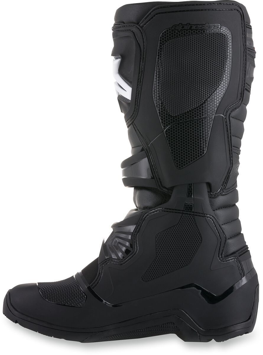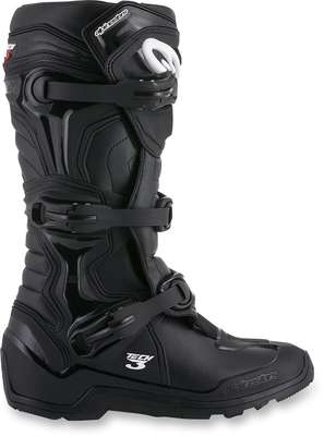 Tech 3 Enduro BootsBoot upper construction is an innovative, lightweight microfiber material that is flexible and abrasion-resistant Light microfiber on front and rear bellows provides a more comfortable flex area Toe box is made of synthetic material for high abrasion resistance Extended Polyurethane (PU) synthetic gaiter helps seal out water and dirt Contoured Thermoplastic Polyurethane (TPU) calf guard, TPU higher medial guard, TPU outer lateral ankle guard and TPU heel counter for support and resistance to impacts Rear TPU gaiter patch applied on the top of the TPU calf protector for comfort and impact resistance on the rear flex area Injected TPU shin plate is connected with the TPU medial guard panel Hook-and-loop upper boot closure with TR flap that provides a wide range of fit and support TPU higher medial protector designed with technical texturing for improved grip Biomechanical medial blade system allows good front/rear boot flex and added support and impact resistance for the ankle Ergonomic TPU triple buckle straps wrap smoothly from the front flex and medial guard to the lateral side of the boot without compromising the boot's flexibility Closure system uses three polymer buckles with ratchet closure, buckle memory system and quick release/locking system with a self-aligning design All boot buckles are replaceable One-piece TPU injected dual-compound foot shell is reinforced by a metal shank inside a co-injected toe reinforcement Soft foam surrounds the ankles and boot collar for comfort and shock-absorbing performance Entire boot is textile lined for comfort Replaceable EVA footbed with textile top lining Alpinestars all-terrain sole design with high-grip rubber compounds; sole is replaceable 68% TPU, 21% Microfiber, 4% Polyurethane, 4% Thermoplastic Rubber & 3% PU Nubuck Synthetic Suede. Inner/lining: 94.45% Textile & 5.55% Synthetic PU