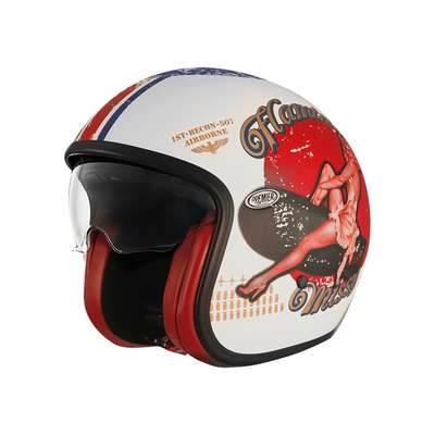 Vintage Pin Up HelmetOuter shell construction is DCA tricomposite fiber consisting of dyneema, carbon and aramid fibers. Inner shell construction is EPS moulded in two sizes for better impact absorption. Comes with a practical retractable Smoke visor. Helmet has two shells to better modulate fit, comfort and aesthetics depending on sizes ranging from XS to XL. Interior is fully removable and washable as well as Sanitized-treated and antiallergenic fabric. Strap features practical rapid-release fastener for micrometric adjustment.