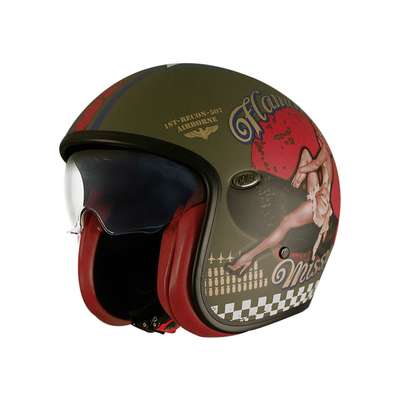 Vintage Pin Up HelmetOuter shell construction is DCA tricomposite fiber consisting of dyneema, carbon and aramid fibers. Inner shell construction is EPS moulded in two sizes for better impact absorption. Comes with a practical retractable Smoke visor. Helmet has two shells to better modulate fit, comfort and aesthetics depending on sizes ranging from XS to XL. Interior is fully removable and washable as well as Sanitized-treated and antiallergenic fabric. Strap features practical rapid-release fastener for micrometric adjustment.