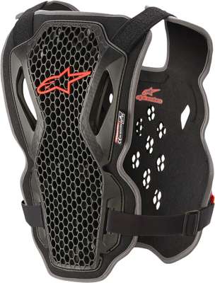 Bionic Action Chest GuardCell Technology chest protector features a highly perforated shell for high levels of ventilation and protection The flexible side adapts to the rider's body shape Features a Cell Technology back protector with a flexion channel for enhanced mobility Removable shoulder pads for high levels of customization Extended padding to offer more protection against tire roost without obstructing arm movement The protectors are perforated for maximum breathability and cooling ventilation Elastic closure system features quick and easy-to-use buckles that fit a broad range of rider body sizes Thermoformed padded chassis for optimized levels of comfort and a close-to-body fit Adjustable shoulder straps for an optimal fit Back protector EN 1621-2:2014 Level 1. Chest Protector EN 1621-3:2018 Level 1. 25% EVA, 25% Polyester, 22% Thermoplastic Elastomermer, 18% Polypropylene, 8% Polyamide & 2% Other
