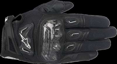 SMX-2 Air Carbon V2 Leather GlovesDurable multi-panel main shell incorporating full-grain leather and 3D mesh An innovative microfiber and Polyurethane (PU) grip insert strategically positioned on palm and thumb Alpinestars exclusive ergonomic stretch insert between palm and thumb Incorporates new premium quality suede palm and landing reinforcement Ergonomically shaped Alpinestars innovative carbon knuckle guard, which is reinforced on the interior for additional protection Finger tops and back hand incorporates polymesh, Thermoplastic Rubber (TPR) inserts Guard is reinforced on the interior side with thick EVA foam for improved levels of fit, comfort and shock absorption Impact-absorbing Ethylene-Vinyl Acetate (EVA) foam panels on thumb 3D mesh finger and thumb surfaces for cooling performance Pre-curved finger construction to reduce riding fatigue Neoprene wrist cuff plus hook and loop and TPR closure Stretch finger sidewalls for improved flexibility and comfort Touchscreen compatible index fingertip and thumb Gloves EN 13594:2015 40% Goat Leather, 25% Polyamide, 23% Polyester, 5% Polyurethane, 4% Carbon Fiber & 3% Other