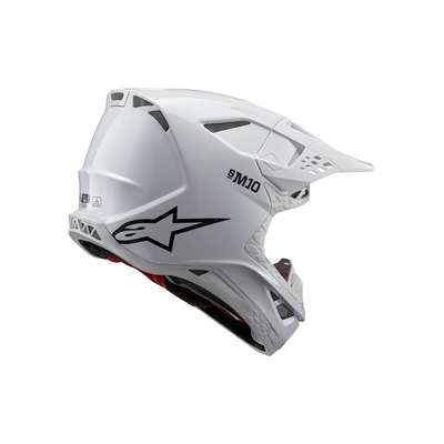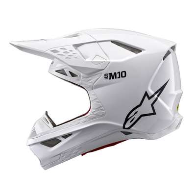 Supertech M10 Solid HelmetThe S-M10 shell sizing solution ensures each helmet fit size has its own appropriate shell size to deliver the most anatomical solution for the wide variety of fit needs, thus ensuring riders have the correct fit to improve comfort, reduce overall weight, and improve effectiveness of the helmet in an impact. Surface curvature promotes reduced friction on impact, allowing deflection and transfer of energy to protect the rider's head from direct force to the skull and referred to the neck and spinal column. The S-M10's design offers a smooth, attractive, aerodynamic profile which is streamlined and free of a y external channels and features that might act as a load point in an impact or compromise the overall integrity of the helmet's construction. Fitted with E-2, last generation of MIPS, integrated low friction layer designed to reduce rotational motion transferred to the brain from angled impacts to the head. Chin bar's base area specifically sculpted to give a relief section and raised to clear the collarbone. Soft EPS liner extends beyond the helmet shell itself and is covered by a flexible rubber compound providing a reduced chance of any sort of collarbone injury. A-Head Fitment System allows easy adjustment of the angle and height that the helmet sits on the head. Ultra-ventilated helmet with 28 individual intake and exhaust ports, not including the eye port, with 18 intakes and 10 exhausts. Eject technology includes the eject helmet removal system. Rotational acceleration and oblique impact performance. Removable side pads, made from a semi-soft polymer for added protection, provide contact area to help spread impact energy. Emergency Release System (ERS) Emergency Visor Release and Visor Extension provides protection. 20% Polyurethane, 17% Polychloroprene, 16% Carbon Fiber, 14% Fiberglass, 12% Polystyrene (EPS), 7% Aramid Fiber, 7% Polyamide, 4% Polyvinil Chloride, 2% Steel & 1% Expanded Polypropylene