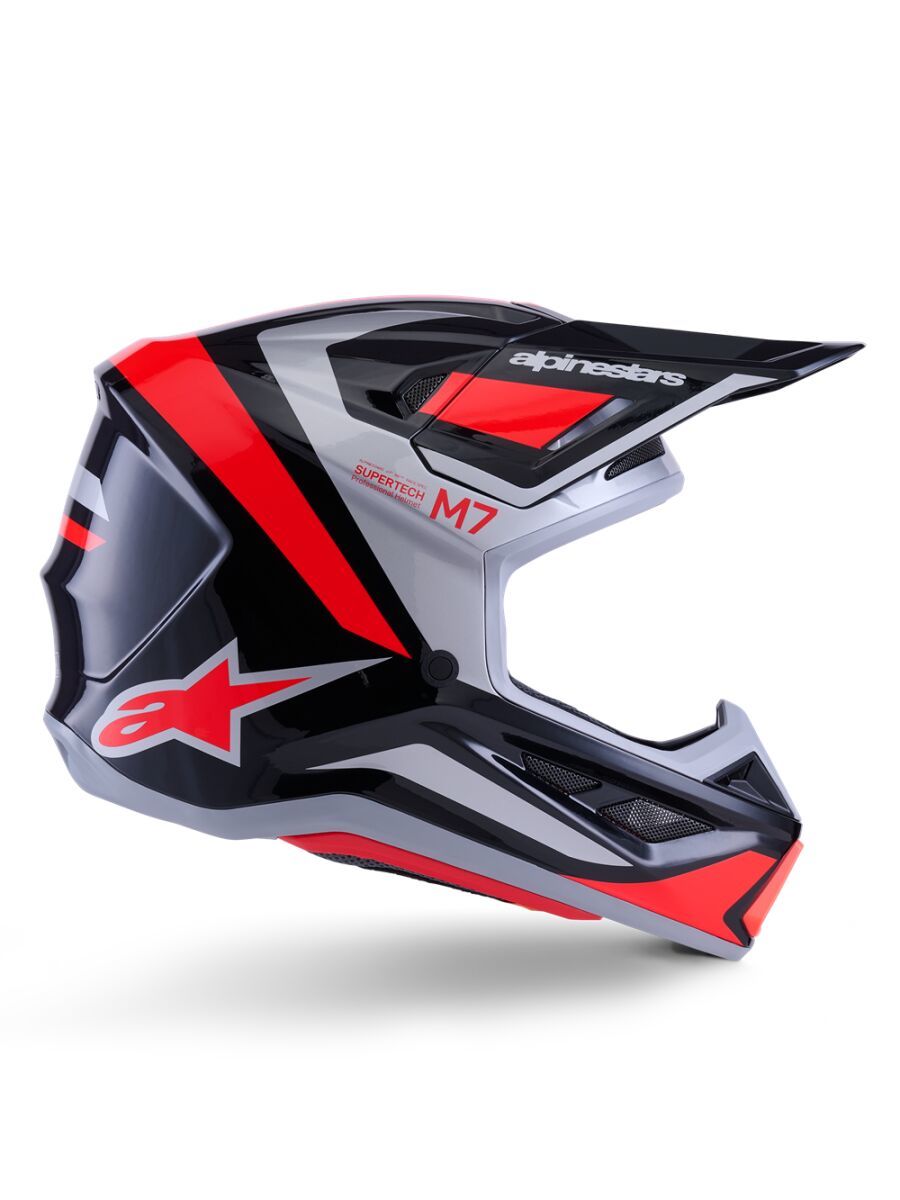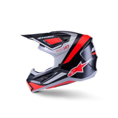 S-M7 Rise HelmetEngineered for off-roading racing, and is optimized to offer the perfect blend of superior ventilation and comfort in a lightweight, helmet while its supremely aerodynamic composite shell delivers exceptional impact protection A-Head Fitment and Visor Detaching System, the S-M7 is equipped with PLASMA technology at the lower side of the shell edge for optimum energy dissipation in case of contact with the collar bone area Key Features Aerodynamic profile design offers a smooth, streamlined shell free of any external channels and features that might act as a load point in an impact or compromise the overall integrity of the helmet's construction The shell's curvature promotes reduced friction on impact, allowing deflection and the most efficient transfer of energy to protect the rider's head from direct force and referred to the neck and spinal column Ultra-ventilated helmet with 20 individual intake and exhaust ports, not including the eye port, with 13 intakes and 7 exhausts, for optimum ventilation The fit can be further customized via the Alpinestars replacement cheek pads, which are available in all thicknesses and are exchangeable between all shell sizes Communication System Compatible — Cutaway section on the left-side of the EPS to seamlessly accommodate Intercom Systems, with earphone recesses on both sides for speakers Construction Linings are removable and washable by hand using warm water and neutral soap Fabrics have antimicrobial treatments Crown Pad — Crown pad and neck pad are elastically connected, for better oblique impact management Top Pad — The top pad is removable and adjustable in height thanks to the A-head system Cheek Pads — The cheek pads are fitted 3D foam, with an emergency extraction system (ERS), with a channel for hydration tube installation Cheek pads are interchangeable among all sizes Chin Strap — Chin strap is fitted with a 25 mm width nylon strap, stainless steel DD rings, removable covers for washing purpose Integrated channels on both sides to accommodate a hydration system Protection Visor Detaching System features a release mechanism is conceived to avoid the inherent weaknesses in other anchoring systems Visor is engineered to automatically detach from the shell when it is subjected to an impact energy greater than 15 Joules for optimum impact protection, regardless of the direction PLASMA inside; Alpinestars PLASMA technology is strategically-integrated into the S-M7's side pads for high performance shock absorption in a critical area, significantly reducing risk of injuries 42% Fiberglass, 20% Polystyrene (EPS), 10% Polyurethane, 8% Polypropylene, 5% Polyvinil Chloride, 5% Steel, 4% Polyamide, 3% Acrylonitrile-Butadiene-Styren, 3% Polyester