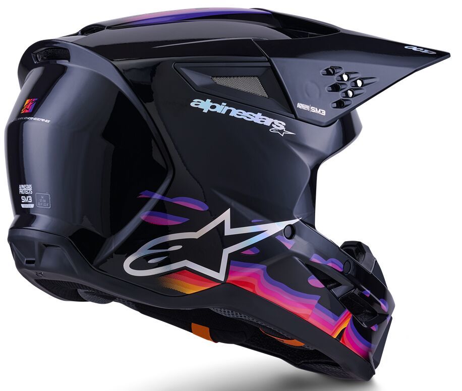 SM3 Force HelmetThe SM3 Helmet is engineered for MX, Enduro and Off-road use featuring innovations and technologies optimized for ease of use, comfort and impact performance. Shell construction featuring a thermo-injected shell incorporating a special polymer blend enhanced by varying degrees of thickness, engineered to deliver optimal combination of impact protection and light weight. Alpinestars patented innovative low friction coating is applied to inner part of the main EPS liner to reduce rotational acceleration forces that can result from certain oblique impacts. This layer acts as a slip plane to mimic the brain's own low friction cerebrospinal fluid, which is the body's natural defence against oblique impacts. Patented visor release system ensures visor release with correct pre-determined force, effectively reducing the forces on the neck during an impact. Maximised ventilation and high levels of heat transfer exchange thanks to 10 inlets and 7 exhaust ports. 48% Acrylonitrile-Butadiene-Styren, 20% Polyurethane, 16% Polystyrene (EPS), 6% Polypropylene, 4% Polyvinil Chloride, 2% Ethylene-Vinyl Acetate, 2% Steel, 1% Expanded Polypropylene, 1% Polyamide