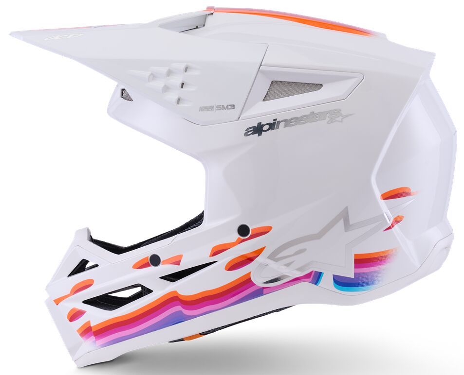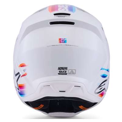 SM3 Force HelmetThe SM3 Helmet is engineered for MX, Enduro and Off-road use featuring innovations and technologies optimized for ease of use, comfort and impact performance. Shell construction featuring a thermo-injected shell incorporating a special polymer blend enhanced by varying degrees of thickness, engineered to deliver optimal combination of impact protection and light weight. Alpinestars patented innovative low friction coating is applied to inner part of the main EPS liner to reduce rotational acceleration forces that can result from certain oblique impacts. This layer acts as a slip plane to mimic the brain's own low friction cerebrospinal fluid, which is the body's natural defence against oblique impacts. Patented visor release system ensures visor release with correct pre-determined force, effectively reducing the forces on the neck during an impact. Maximised ventilation and high levels of heat transfer exchange thanks to 10 inlets and 7 exhaust ports. 48% Acrylonitrile-Butadiene-Styren, 20% Polyurethane, 16% Polystyrene (EPS), 6% Polypropylene, 4% Polyvinil Chloride, 2% Ethylene-Vinyl Acetate, 2% Steel, 1% Expanded Polypropylene, 1% Polyamide