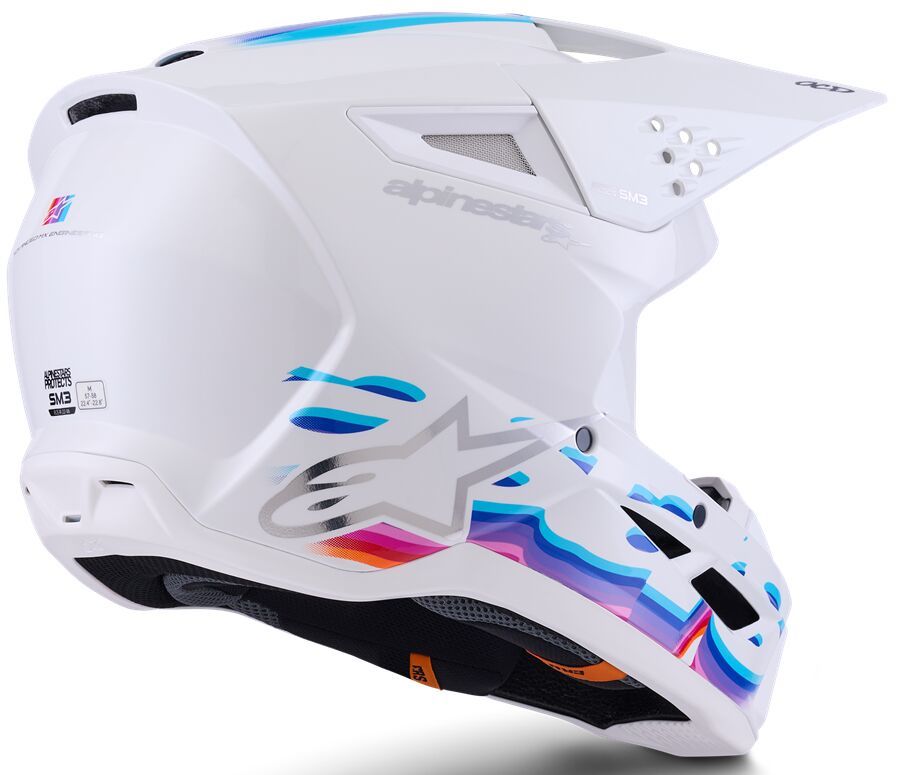 SM3 Force HelmetThe SM3 Helmet is engineered for MX, Enduro and Off-road use featuring innovations and technologies optimized for ease of use, comfort and impact performance. Shell construction featuring a thermo-injected shell incorporating a special polymer blend enhanced by varying degrees of thickness, engineered to deliver optimal combination of impact protection and light weight. Alpinestars patented innovative low friction coating is applied to inner part of the main EPS liner to reduce rotational acceleration forces that can result from certain oblique impacts. This layer acts as a slip plane to mimic the brain's own low friction cerebrospinal fluid, which is the body's natural defence against oblique impacts. Patented visor release system ensures visor release with correct pre-determined force, effectively reducing the forces on the neck during an impact. Maximised ventilation and high levels of heat transfer exchange thanks to 10 inlets and 7 exhaust ports. 48% Acrylonitrile-Butadiene-Styren, 20% Polyurethane, 16% Polystyrene (EPS), 6% Polypropylene, 4% Polyvinil Chloride, 2% Ethylene-Vinyl Acetate, 2% Steel, 1% Expanded Polypropylene, 1% Polyamide