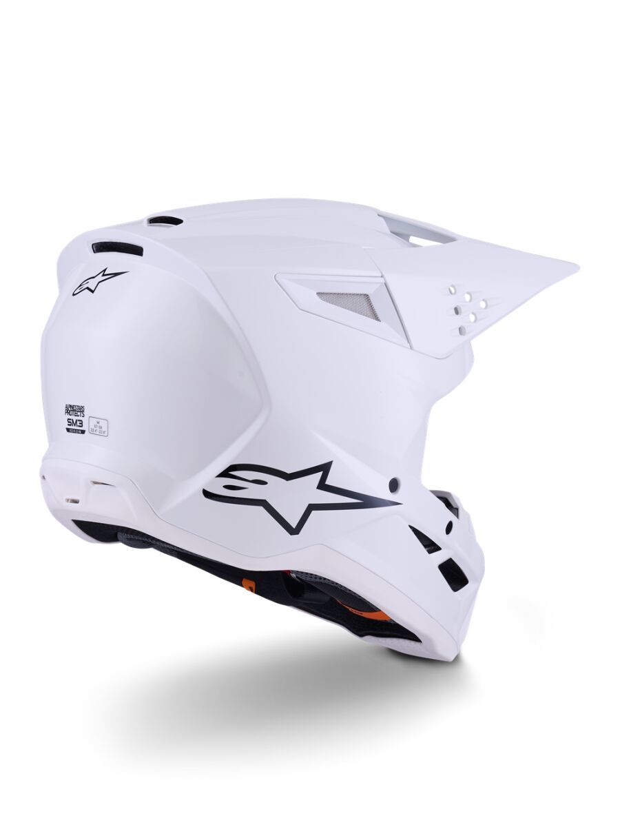 SM3 Solid HelmetThe S-M3 Helmet is engineered for MX, Enduro and Off-road use featuring innovations and technologies optimized for ease of use, comfort and impact performance. Shell construction featuring a thermo-injected shell incorporating a special polymer blend enhanced by varying degrees of thickness, engineered to deliver optimal combination of impact protection and light weight. Alpinestars patented innovative low friction coating is applied to inner part of the main EPS liner to reduce rotational acceleration forces that can result from certain oblique impacts. This layer acts as a slip plane to mimic the brain's own low friction cerebrospinal fluid, which is the body's natural defence against oblique impacts. Patented visor release system ensures visor release with correct pre-determined force, effectively reducing the forces on the neck during an impact. Maximised ventilation and high levels of heat transfer exchange thanks to 10 inlets and 7 exhaust ports. 48% Acrylonitrile-Butadiene-Styren, 20% Polyurethane, 16% Polystyrene (EPS), 6% Polypropylene, 4% Polyvinil Chloride, 2% Ethylene-Vinyl Acetate, 2% Steel, 1% Expanded Polypropylene, 1% Polyamide