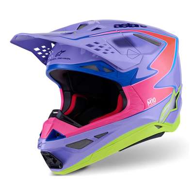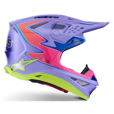 Supertech M10 Jett Lawrence R01 HelmetThe S-M10's design offers a smooth, attractive, aerodynamic profile which is streamlined and free of any external channels and features that might act as a load point in an impact or compromise the overall integrity of the helmet's construction Surface curvature promotes reduced friction on impact, allowing deflection and transfer of energy to protect the rider's head from direct force to the skull and referred to the neck and spinal column The S-M10 shell sizing solution ensures each helmet fit size has its own appropriate shell size to deliver the most anatomical solution for the wide variety of fit needs, thus ensuring riders have the correct fit to improve comfort, reduce overall weight, and improve effectiveness of the helmet in an impact Chin bar's base area specifically sculpted to give a relief section and raised to clear the collarbone Soft EPS liner extends beyond the helmet shell itself and is covered by a flexible rubber compound providing a reduced chance of any sort of collarbone injury Mips® Multi-directional Impact Protection System. A-Head Fitment System allows easy adjustment of the angle and height that the helmet sits on the head Ultra-ventilated helmet with 28 individual intake and exhaust ports, not including the eye port, with 18 intakes and 10 exhausts Equipped with MIPS Multi-directional Impact Protection System. Eject technology includes the eject helmet removal system Rotational acceleration and oblique impact performance Removable side pads, made from a semi-soft polymer for added protection, provide contact area to help spread impact energy Emergency Release System (ERS) Emergency Visor Release and Visor Extension provides protection