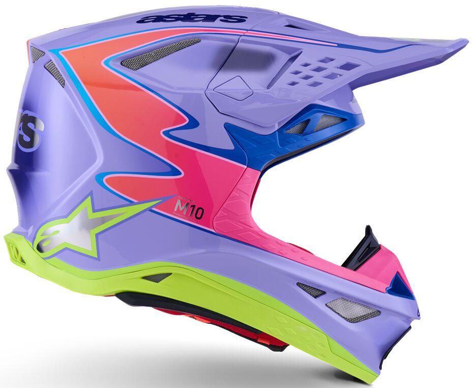 Supertech M10 Jett Lawrence R01 HelmetThe S-M10's design offers a smooth, attractive, aerodynamic profile which is streamlined and free of any external channels and features that might act as a load point in an impact or compromise the overall integrity of the helmet's construction Surface curvature promotes reduced friction on impact, allowing deflection and transfer of energy to protect the rider's head from direct force to the skull and referred to the neck and spinal column The S-M10 shell sizing solution ensures each helmet fit size has its own appropriate shell size to deliver the most anatomical solution for the wide variety of fit needs, thus ensuring riders have the correct fit to improve comfort, reduce overall weight, and improve effectiveness of the helmet in an impact Chin bar's base area specifically sculpted to give a relief section and raised to clear the collarbone Soft EPS liner extends beyond the helmet shell itself and is covered by a flexible rubber compound providing a reduced chance of any sort of collarbone injury Mips® Multi-directional Impact Protection System. A-Head Fitment System allows easy adjustment of the angle and height that the helmet sits on the head Ultra-ventilated helmet with 28 individual intake and exhaust ports, not including the eye port, with 18 intakes and 10 exhausts Equipped with MIPS Multi-directional Impact Protection System. Eject technology includes the eject helmet removal system Rotational acceleration and oblique impact performance Removable side pads, made from a semi-soft polymer for added protection, provide contact area to help spread impact energy Emergency Release System (ERS) Emergency Visor Release and Visor Extension provides protection