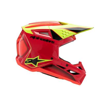 Youth S-M3 Fray HelmetAnatomically engineered and profiled specifically for youth and younger riders, the all-new SM3 Youth Helmet is optimized for MX, Enduro and Off-road use. This lightweight helmet features a thermo-injected shell incorporating a special polymer blend enhanced by varying degrees of thickness that is engineered to deliver the optimal combination of impact protection and light weight. Lightweight outer shell is constructed from a technologically advanced impact resistant thermoplastic in three sizes (Youth Small, Youth Medium and Youth Large. The SM3 Youth weighs 1060g. The fit can be tailored to the rider’s head thanks to the helmet’s crown and cheek pads, which are available as genuine spare parts in different thicknesses. Youth Medium and Youth Large sizes share the same EPS size, which allows riders with an YM size to initially buy an YM helmet and then configure it to a Youth Large size as they grow via the crown and cheek pad spare parts. The Youth Small has a smaller EPS size and can be customized only via the cheek pads. Alpinestars extensive research has shown that the kids that wear a YS size are very small, typically 3 to 4 years old, and therefore they require a dedicated helmet fit. Multiple density inner liner ensures the helmet is equipped with the correct density in the correct area for enhanced impact absorption, while also helping reduce overall weight. The inner and outer surfaces are engineered to minimize the effects of oblique impacts. Alpinestars patented low friction coating is applied to the inner part of the main EPS liner to reduce the rotational acceleration forces that can result from certain oblique impacts. This layer essentially acts as a slip plane to mimic the brain’s own low friction cerebrospinal fluid, which is the body’s natural defense against oblique impacts. Patented visor release system ensures the visor is released with the correct pre-determined amount of force, effectively reducing the forces on the rider’s neck during an impact. Comfort liner is constructed using recycled materials for a lower carbon footprint. Hydration tube channels are integrated into the helmet’s cheek pads for convenience and performance. Safety Alpinestars has introduced a new in-house standard for the SM3 Youth to test the helmet’s chin to conditions heavier than the homologation standard, and in order to pass the Alpinestars’ new standards, the shell thickness and the structure of the helmet design itself have both been optimized on the chin area for superior impact performance. Equipped with an Emergency Release System and removable cheek pads to permit the safe and easy removal of the cheek pads while the helmet is still on, while the 3D contoured foam ensures rider comfort. Soft textile chin strap is 25mm for optimal safety and rider comfort. Stainless steel D-rings ensure a tight and secure fit. Ventilation Maximized ventilation and high levels of heat transfer exchange thanks to 10 inlets and seven exhaust ports. The visor has been designed to direct air into the ports for enhanced airflow.