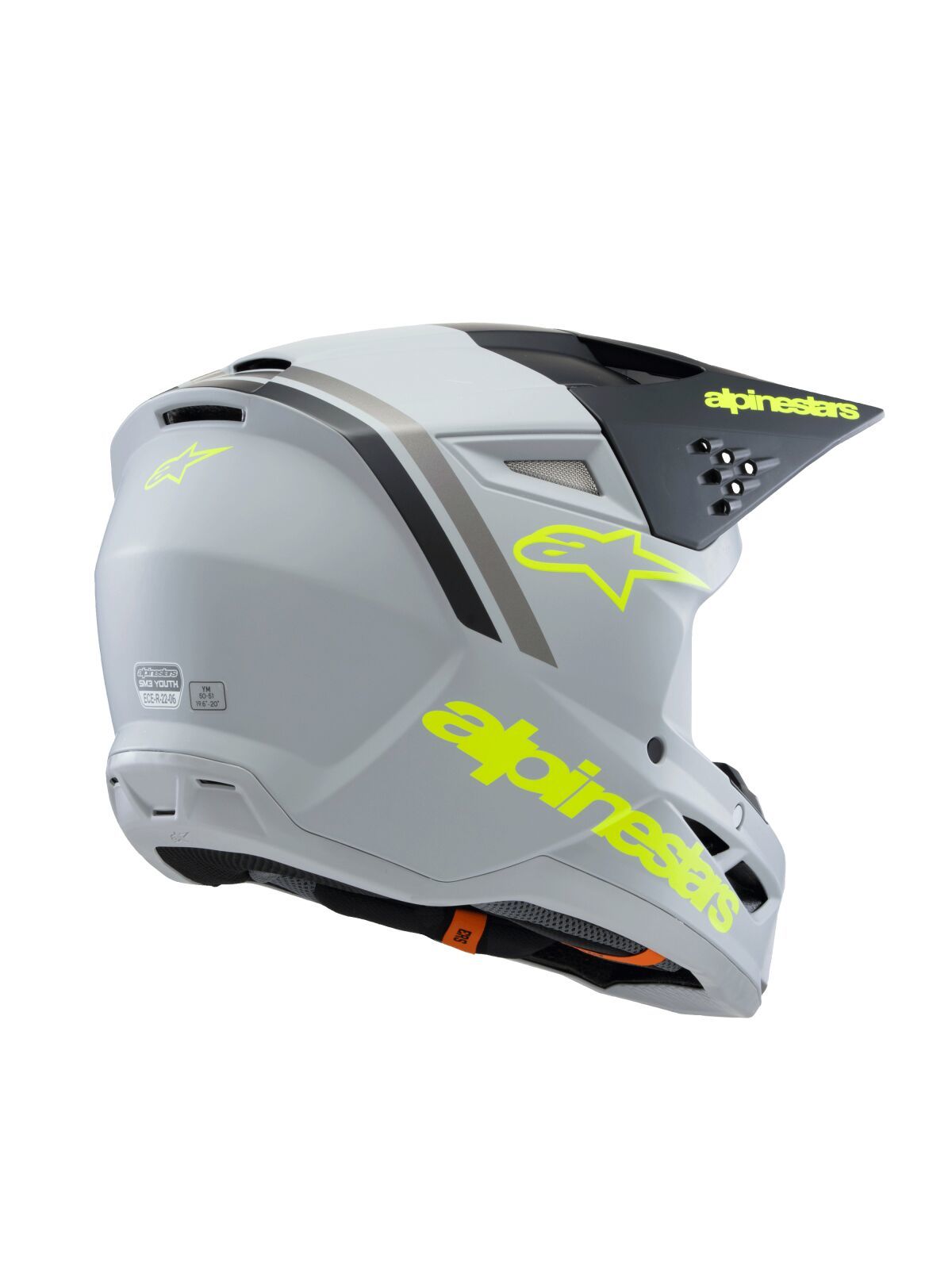 Youth SM3 Radium HelmetAnatomically engineered and profiled specifically for youth and younger riders, the all-new SM3 Youth Helmet is optimized for MX, Enduro and Off-road use. This lightweight helmet features a thermo-injected shell incorporating a special polymer blend enhanced by varying degrees of thickness that is engineered to deliver the optimal combination of impact protection and light weight. Lightweight outer shell is constructed from a technologically advanced impact resistant thermoplastic in three sizes (Youth Small, Youth Medium and Youth Large. The SM3 Youth weighs 1060g. The fit can be tailored to the rider’s head thanks to the helmet’s crown and cheek pads, which are available as genuine spare parts in different thicknesses. Youth Medium and Youth Large sizes share the same EPS size, which allows riders with an YM size to initially buy an YM helmet and then configure it to a Youth Large size as they grow via the crown and cheek pad spare parts. The Youth Small has a smaller EPS size and can be customized only via the cheek pads. Alpinestars extensive research has shown that the kids that wear a YS size are very small, typically 3 to 4 years old, and therefore they require a dedicated helmet fit. Multiple density inner liner ensures the helmet is equipped with the correct density in the correct area for enhanced impact absorption, while also helping reduce overall weight. The inner and outer surfaces are engineered to minimize the effects of oblique impacts. Alpinestars patented low friction coating is applied to the inner part of the main EPS liner to reduce the rotational acceleration forces that can result from certain oblique impacts. This layer essentially acts as a slip plane to mimic the brain’s own low friction cerebrospinal fluid, which is the body’s natural defense against oblique impacts. Patented visor release system ensures the visor is released with the correct pre-determined amount of force, effectively reducing the forces on the rider’s neck during an impact. Comfort liner is constructed using recycled materials for a lower carbon footprint. Hydration tube channels are integrated into the helmet’s cheek pads for convenience and performance. Safety Alpinestars has introduced a new in-house standard for the SM3 Youth to test the helmet’s chin to conditions heavier than the homologation standard, and in order to pass the Alpinestars’ new standards, the shell thickness and the structure of the helmet design itself have both been optimized on the chin area for superior impact performance. Equipped with an Emergency Release System and removable cheek pads to permit the safe and easy removal of the cheek pads while the helmet is still on, while the 3D contoured foam ensures rider comfort. Soft textile chin strap is 25mm for optimal safety and rider comfort. Stainless steel D-rings ensure a tight and secure fit. Ventilation Maximized ventilation and high levels of heat transfer exchange thanks to 10 inlets and seven exhaust ports. The visor has been designed to direct air into the ports for enhanced airflow.