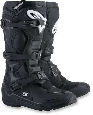 Tech 3 Enduro BootsBoot upper construction is an innovative, lightweight microfiber material that is flexible and abrasion-resistant Light microfiber on front and rear bellows provides a more comfortable flex area Toe box is made of synthetic material for high abrasion resistance Extended Polyurethane (PU) synthetic gaiter helps seal out water and dirt Contoured Thermoplastic Polyurethane (TPU) calf guard, TPU higher medial guard, TPU outer lateral ankle guard and TPU heel counter for support and resistance to impacts Rear TPU gaiter patch applied on the top of the TPU calf protector for comfort and impact resistance on the rear flex area Injected TPU shin plate is connected with the TPU medial guard panel Hook-and-loop upper boot closure with TR flap that provides a wide range of fit and support TPU higher medial protector designed with technical texturing for improved grip Biomechanical medial blade system allows good front/rear boot flex and added support and impact resistance for the ankle Ergonomic TPU triple buckle straps wrap smoothly from the front flex and medial guard to the lateral side of the boot without compromising the boot's flexibility Closure system uses three polymer buckles with ratchet closure, buckle memory system and quick release/locking system with a self-aligning design All boot buckles are replaceable One-piece TPU injected dual-compound foot shell is reinforced by a metal shank inside a co-injected toe reinforcement Soft foam surrounds the ankles and boot collar for comfort and shock-absorbing performance Entire boot is textile lined for comfort Replaceable EVA footbed with textile top lining Alpinestars all-terrain sole design with high-grip rubber compounds; sole is replaceable 68% TPU, 21% Microfiber, 4% Polyurethane, 4% Thermoplastic Rubber & 3% PU Nubuck Synthetic Suede. Inner/lining: 94.45% Textile & 5.55% Synthetic PU