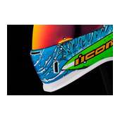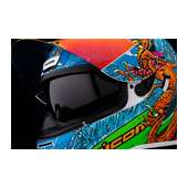 Airform™ Dino Fury HelmetContinuous venting system Injection molded polycarbonate shell for strength Internal airflow geometry Sculpted neck roll Fog-free ICON Optics™ Shield with Rapid-Release™ System Prolock™ positive shield locking system The Dropshield™ visor must only be used while the main face shield is in the fully closed position Internal Dropshield™ with exterior switch Removable molded breath deflector Removable Hydradry™ 3-piece moisture wicking liner Internal speaker pockets work with ICON's R.A.U. Bluetooth device Includes Clear & RST Red ICON Optics™ Shields Includes Dark Smoke Dropshield™