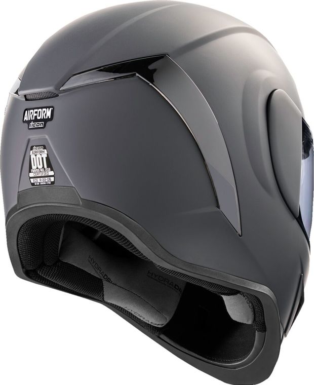 Airform™ Dark HelmetInjection molded polycarbonate shell for strength Sculpted neck roll Fog-free ICON Optics™ Shield with Rapid-Release™ System Prolock™ positive shield locking system Internal airflow geometry Continuous venting system The Dropshield™ visor must only be used while the main face shield is in the fully closed position Removable molded breath deflector Internal Dropshield™ with exterior switch Removable Hydradry™ 3-piece moisture wicking liner Internal speaker pockets work with ICON's R.A.U. Bluetooth device Includes Clear & Dark Smoke ICON Optics™ Shield Includes Dark Smoke Dropshield™ Includes Rubatone Chin Vents™
