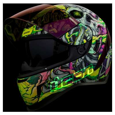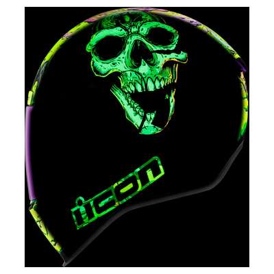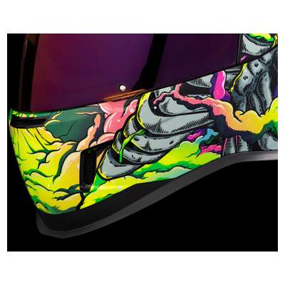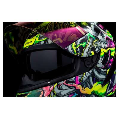 Airform™ Hippy Dippy HelmetInjection-molded polycarbonate shell for strength and durability Intermediate-oval headform Clear Fog-Free Optics™ shield installed Purple RST Fog-Free Optics™ shield included Dark smoke internal DropShield™ Prolock™ shield locking system Moisture-Wicking Hydradry™ removable comfort liner Purple RST Spoiler Kit Glow in the Dark Graphics Internal airflow geometry Continuous venting system Sculpted neck roll Fog-free ICON Optics™ Shield with Rapid-Release™ System The Dropshield™ visor must only be used while the main face shield is in the fully closed position Removable molded breath deflector Internal speaker pockets work with ICON's R.A.U. Bluetooth device