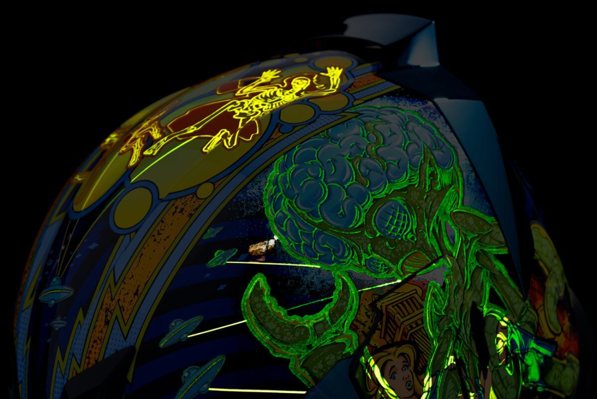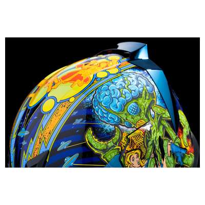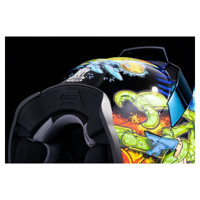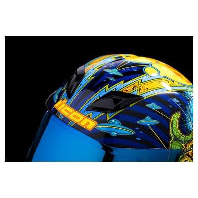 Airflite™ Bugoid Blitz HelmetInjection-molded polycarbonate shell for strength and durability Intermediate-oval headform Fog-free Fliteshield™ and internal DropShield™ give you a clear view of the street in any kind of lighting Clear Fog-Free Fliteshield™ installed RST Blue Fog-Free Fliteshield™ included Dark Smoke internal DropShield™ Moisture-Wicking Hydradry™ removable comfort liner Includes RST Blue Spoiler Glow-in-the-dark Multiple oversized intake and exhaust ports Fog-Free Dropshield™ with exterior switch Quick-change Fog-Free Fliteshield™ with sideplates Removable molded breath deflector and chin curtain Recessed twin channel supervent cooling system The Dropshield™ visor must only be used while the main face shield is in the fully closed position Internal speaker pockets work with ICON's R.A.U. Bluetooth device