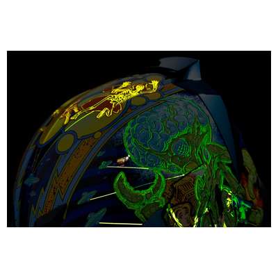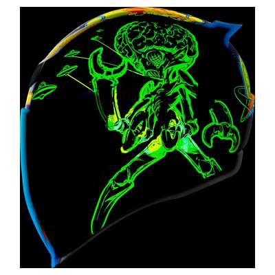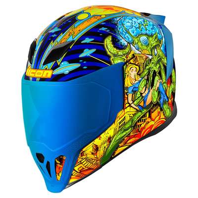 Airflite™ Bugoid Blitz HelmetInjection-molded polycarbonate shell for strength and durability Intermediate-oval headform Fog-free Fliteshield™ and internal DropShield™ give you a clear view of the street in any kind of lighting Clear Fog-Free Fliteshield™ installed RST Blue Fog-Free Fliteshield™ included Dark Smoke internal DropShield™ Moisture-Wicking Hydradry™ removable comfort liner Includes RST Blue Spoiler Glow-in-the-dark Multiple oversized intake and exhaust ports Fog-Free Dropshield™ with exterior switch Quick-change Fog-Free Fliteshield™ with sideplates Removable molded breath deflector and chin curtain Recessed twin channel supervent cooling system The Dropshield™ visor must only be used while the main face shield is in the fully closed position Internal speaker pockets work with ICON's R.A.U. Bluetooth device