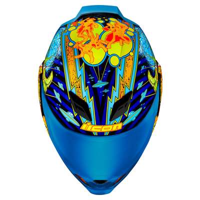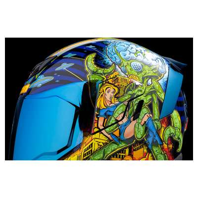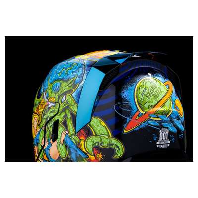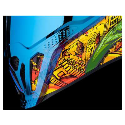 Airflite™ Bugoid Blitz HelmetInjection-molded polycarbonate shell for strength and durability Intermediate-oval headform Fog-free Fliteshield™ and internal DropShield™ give you a clear view of the street in any kind of lighting Clear Fog-Free Fliteshield™ installed RST Blue Fog-Free Fliteshield™ included Dark Smoke internal DropShield™ Moisture-Wicking Hydradry™ removable comfort liner Includes RST Blue Spoiler Glow-in-the-dark Multiple oversized intake and exhaust ports Fog-Free Dropshield™ with exterior switch Quick-change Fog-Free Fliteshield™ with sideplates Removable molded breath deflector and chin curtain Recessed twin channel supervent cooling system The Dropshield™ visor must only be used while the main face shield is in the fully closed position Internal speaker pockets work with ICON's R.A.U. Bluetooth device