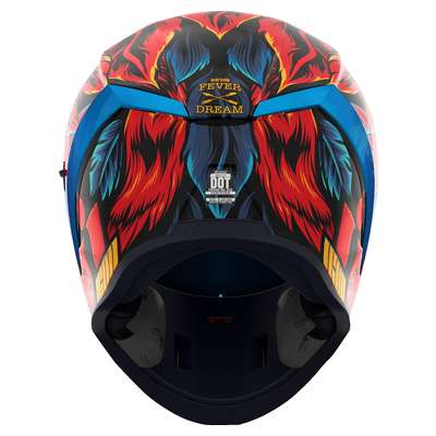 Airform™ Fever Dream HelmetInjection molded polycarbonate shell for strength Internal airflow geometry Continuous venting system Sculpted neck roll Fog-free ICON Optics™ Shield with Rapid-Release™ System Prolock™ positive shield locking system Internal Dropshield™ with exterior switch The Dropshield™ visor must only be used while the main face shield is in the fully closed position Removable molded breath deflector Removable Hydradry™ 3-piece moisture wicking liner Internal speaker pockets work with ICON's R.A.U. Bluetooth device Includes Clear & RST Blue fog-free Optics™ shield