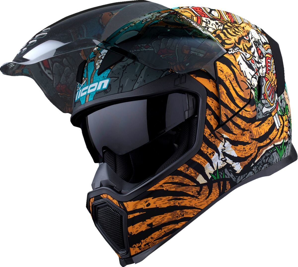 Airflite™ Edo MIPS® HelmetInjection molded polycarbonate shell for strength Multiple oversized intake and exhaust ports Fog-Free Dropshield™ with exterior switch Quick-change Fog-Free Fliteshield™ with side plates Removable molded breath deflector and chin curtain Recessed twin channel supervent cooling system The Dropshield™ visor must only be used while the main face shield is in the fully closed position Internal speaker pockets work with ICON's R.A.U. Bluetooth device Removable Hydradry™ moisture wicking liner Includes Clear and Dark Smoke Fliteshields™ Includes Dark Smoke Dropshield™