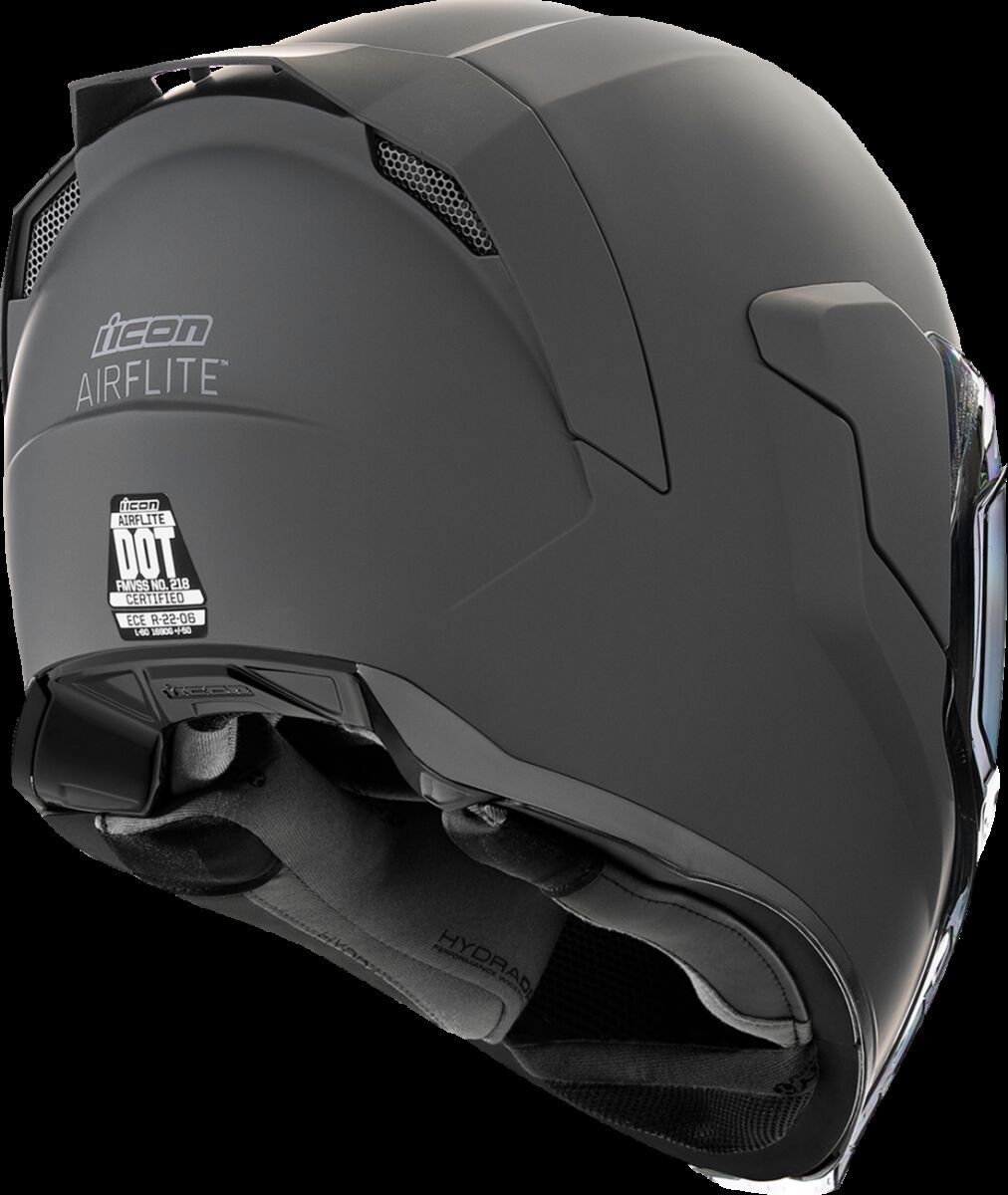 Airflite™ Dark HelmetInjection molded polycarbonate shell for strength Multiple oversized intake and exhaust ports Fog-Free Dropshield™ with exterior switch Quick-change Fog-Free Fliteshield™ with side plates Removable molded breath deflector and chin curtain Recessed twin channel supervent cooling system The Dropshield™ visor must only be used while the main face shield is in the fully closed position Internal speaker pockets work with ICON's R.A.U. Bluetooth device Removable Hydradry™ moisture wicking liner Includes Clear Fliteshield™ and Dark Smoke Forceshield™ Includes Dark Smoke Dropshield™