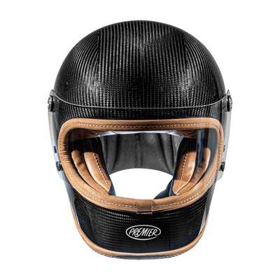 Trophy Platinum Edition Carbon HelmetExternal shell construction is moulded with a DCA multi-axial structure composed of carbon and aramid fibres blended with an epoxy resin. Inner shell construction has differentiated density EPS for better absorption of the energy generated by an impact. Combination of inner and external shell construction results in lightweight, durable and comfortable helmet. Anti-scratch treated visor attaches to shell with mechanism that regulates its movement. Internal linings created in Sanitized-treated, antiallergenic fabric with a synthetic leather finish. The strap has a double ring fastener. Platinum Edition comes with coloured seams matching the graphic designs, leather elements and special branded on fire Premier logos.