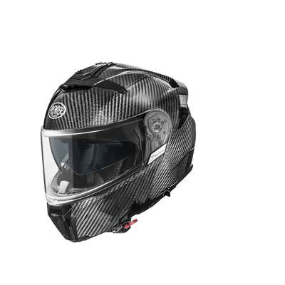 Legacy GT Carbon HelmetInner shell construction is EPS material allocated at different densities to disperse energy released in case of impact. Outer shell construction uses two mould sizes to increase performance dependant on size, using aramid carbon fiber combined with epoxy resin to make shell lightweight, elastic and resistant. Flip-up function transforms helmet from full face to open face without having to remove the chin guard itself. Chin guard is precisely entirely made of carbon fiber. Opening and closing mechanism is easily operated by a button on lower part of the chin guard. Small shell sizes range from XS to M and larger shell size covers L to XXL. Visor is injection moulded transparent polycarbonate and has anti-scratch treatment. In addition helmet includes concealed internal Dark visor also anti-scratch treated, easily operated with one hand via button located on the lower edge of the outer shell. Ventilation is provided by an air intake on the chin guard and tow extractors positioned on upper part of shell for optimal ventilation. All ventilation devices are adjustable for controlling the level of ventilation. "Advanced Padding System" kit included with the helmet allows interior to be customized for better fit and comfort. The interiors are completely removable and washable and made hypoallergenic thanks to the Sanitized treatment. Equipped with external housing for the installation of Bluetooth® communication devices. Equipped with micrometric chinstrap for easy adjustment and quick release. Nose guard and chinstrap are standard equipment.