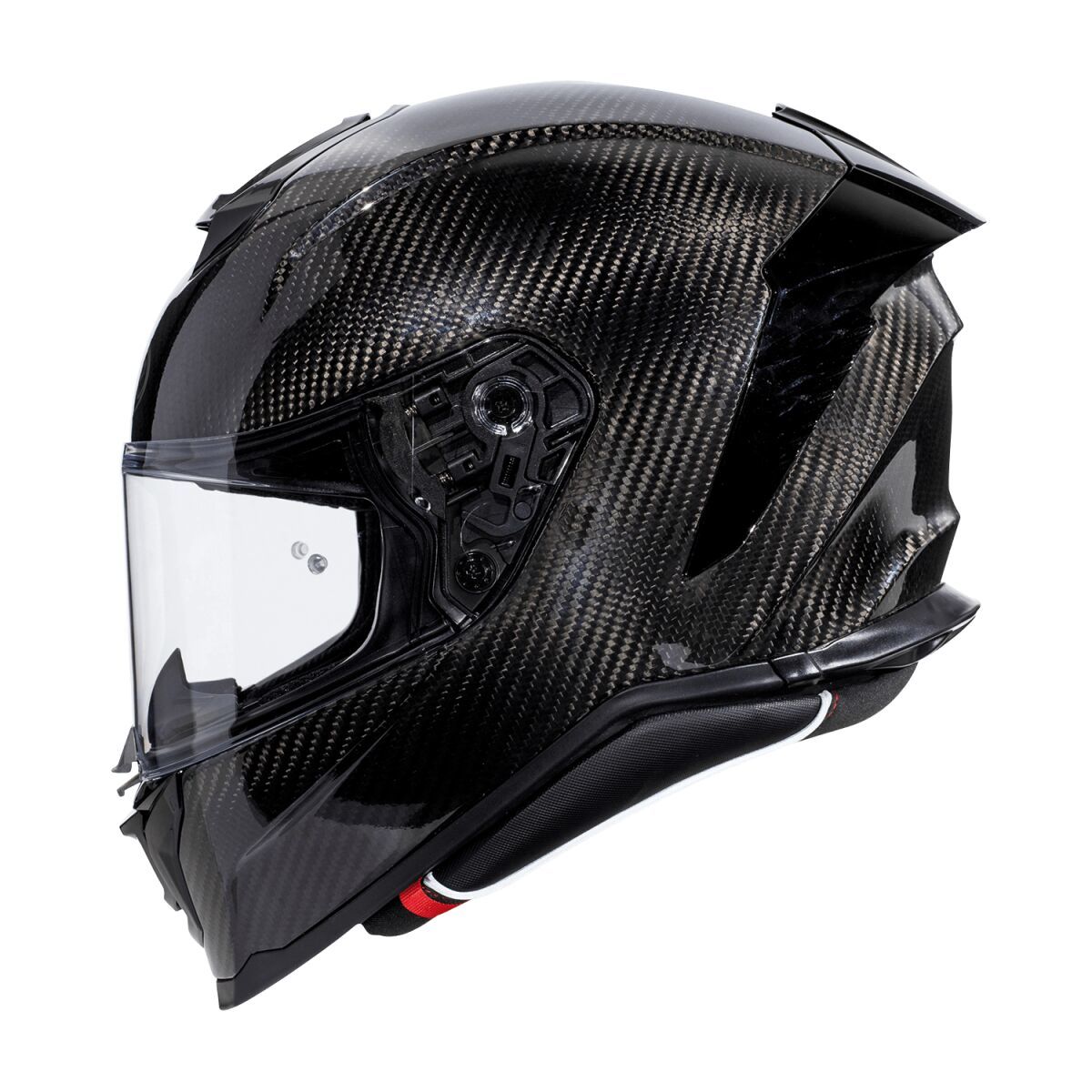 Hyper Carbon HelmetOuter shell is produced in double measure to ensure better fit. Outer shell construction is made of carbon fiber that makes the helmet lightweight but resistant in case of impact. Inner shell construction is pressure-plated in EPS with differentiated density. Air vents on top of the shell and on chin ensure air flow while rear extractor ensures circulation of air. Visor block is placed in the center of the chin strap and is easy to operate: a simple click makes the helmet even quieter and safer especially at high speeds. Advanced padding System kit included allows fit customisation and all interiors are breathable, removable, washable and hypoallergenic thanks to the Sanitized treatment. Locking system is double-ring. Predisposed to the installation of Bluetooth® communication systems. High-strength clear visor with anti-scratch treatment and designed for insertion of the Pinlock® anti-fog system included. Pinlock® lens is included.