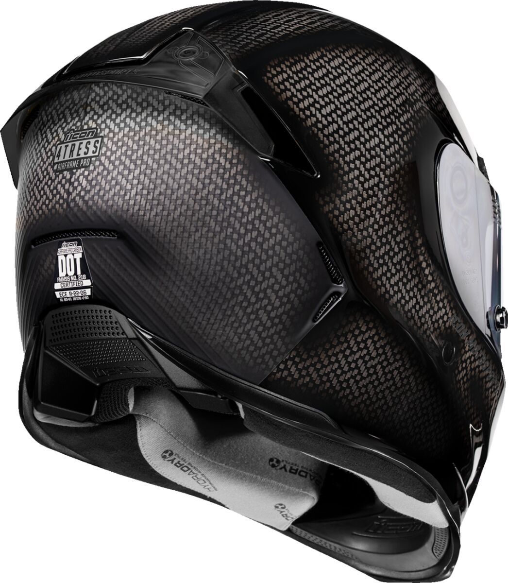 Airframe Pro™ Carbon 4Tress HelmetHandcrafted composite carbon fiber shell Sculpted neck roll reduces jacket/suit interference Five-piece modular liner with moisture-wicking Hydradry™ Linear ported forehead vents Low-profile vents throughout the shell Fog-free ICON Optics™ Shield with Rapid-Release™ system Prolock™ positive shield locking system Removable breath deflector and chin curtain Includes Dark Smoke & Clear TracShields™