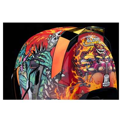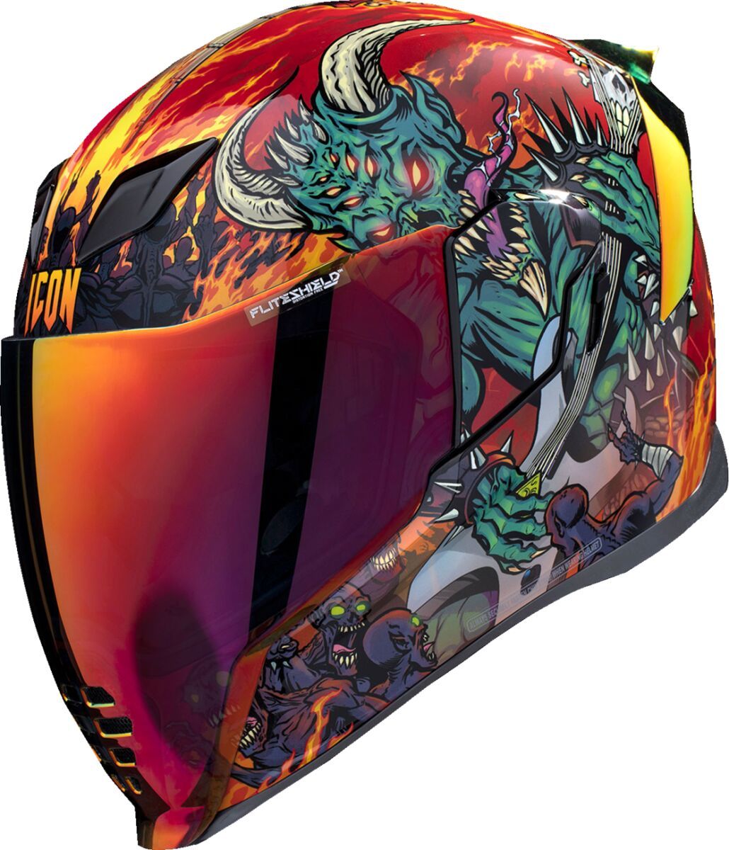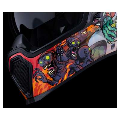 Airflite™ Blegh MIPS® HelmetRemovable molded breath deflector and chin curtain Injection molded polycarbonate shell for strength Fog-Free Dropshield™ with exterior switch Recessed twin channel supervent cooling system Multiple oversized intake and exhaust ports Quick-change Fog-Free Fliteshield™ with side plates The Dropshield™ visor must only be used while the main face shield is in the fully closed position Removable Hydradry™ moisture wicking liner Glow in the dark Internal speaker pockets work with ICON's R.A.U. Bluetooth device Includes Clear & RST Sunset fog-free Fliteshield™