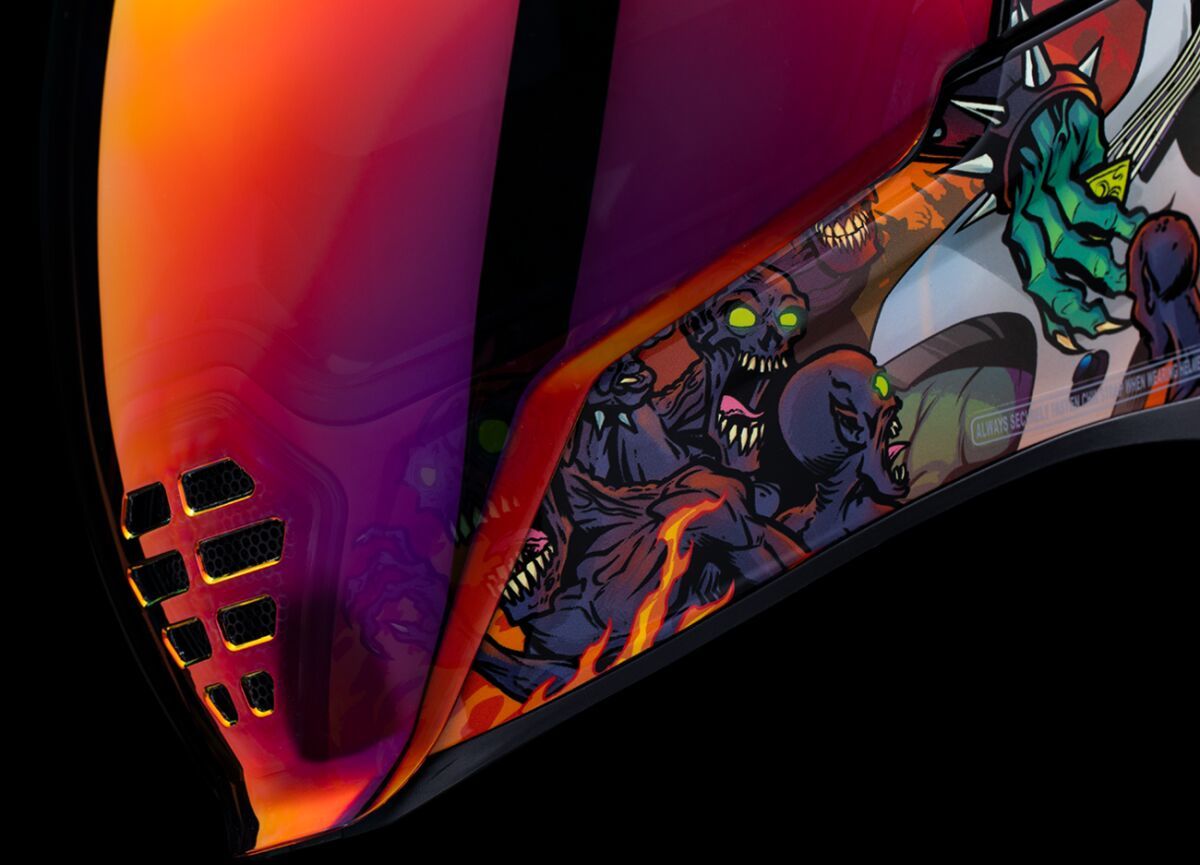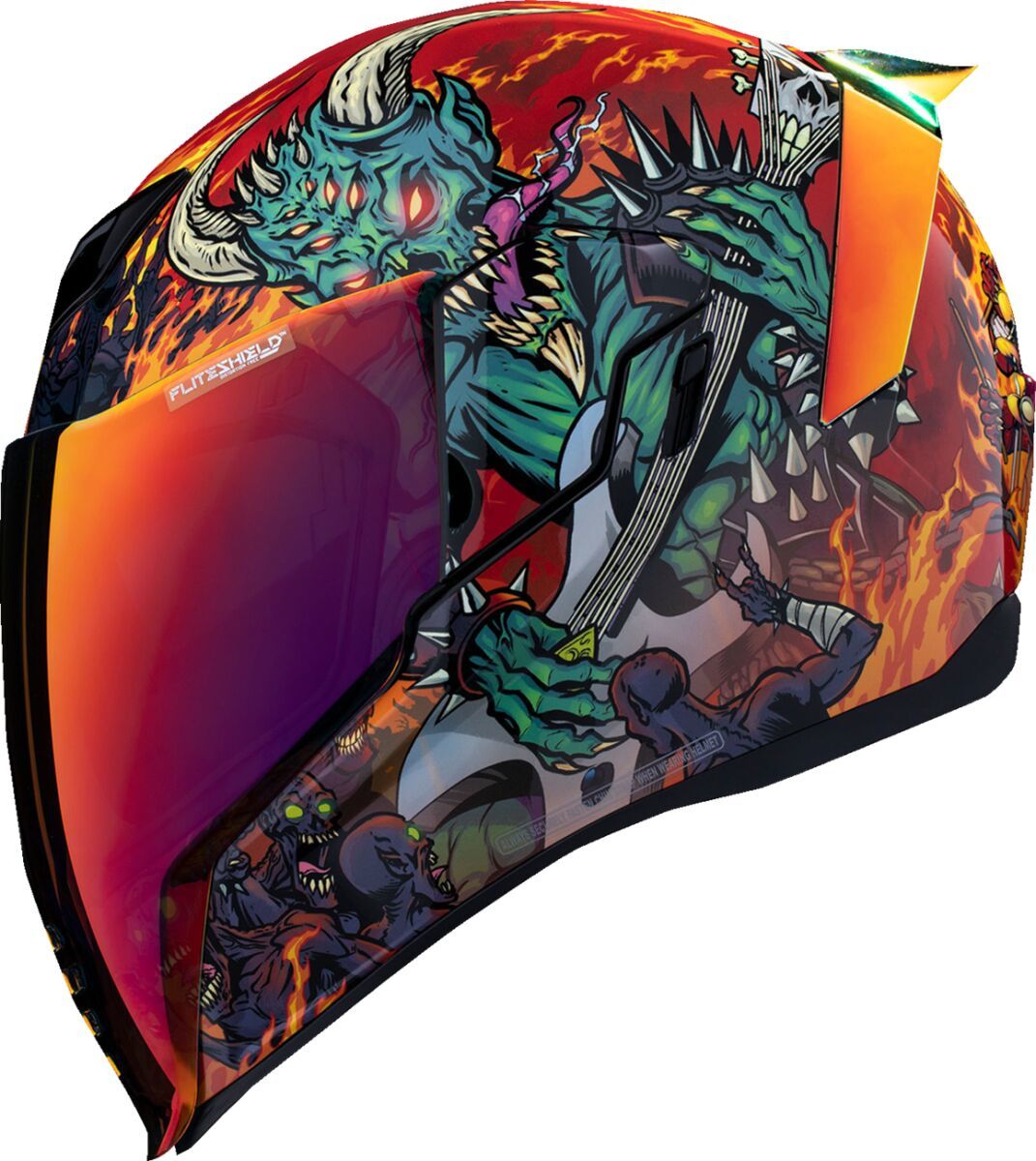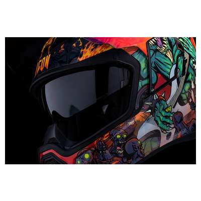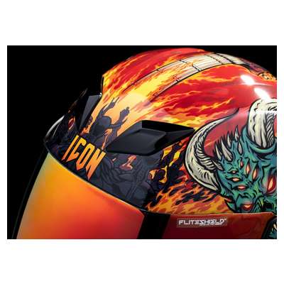 Airflite™ Blegh MIPS® HelmetRemovable molded breath deflector and chin curtain Injection molded polycarbonate shell for strength Fog-Free Dropshield™ with exterior switch Recessed twin channel supervent cooling system Multiple oversized intake and exhaust ports Quick-change Fog-Free Fliteshield™ with side plates The Dropshield™ visor must only be used while the main face shield is in the fully closed position Removable Hydradry™ moisture wicking liner Glow in the dark Internal speaker pockets work with ICON's R.A.U. Bluetooth device Includes Clear & RST Sunset fog-free Fliteshield™