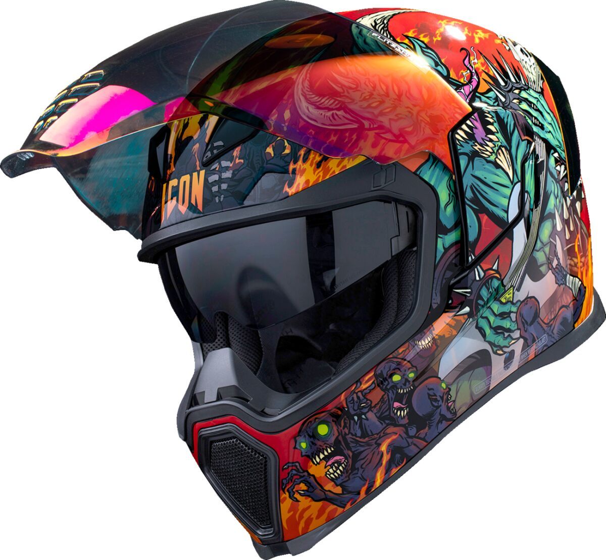 Airflite™ Blegh MIPS® HelmetRemovable molded breath deflector and chin curtain Injection molded polycarbonate shell for strength Fog-Free Dropshield™ with exterior switch Recessed twin channel supervent cooling system Multiple oversized intake and exhaust ports Quick-change Fog-Free Fliteshield™ with side plates The Dropshield™ visor must only be used while the main face shield is in the fully closed position Removable Hydradry™ moisture wicking liner Glow in the dark Internal speaker pockets work with ICON's R.A.U. Bluetooth device Includes Clear & RST Sunset fog-free Fliteshield™